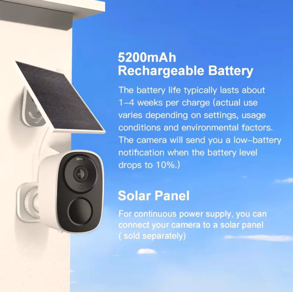 It breaks the limitations of traditional cameras, which "depend on power sources and are bound by wiring". It is equipped with a 5200mAh large-capacity rechargeable battery, and can operate continuously for 1-4 weeks after a single charge (actual battery life may vary depending on the usage scenario); it can be paired with an optional solar panel, which automatically charges during sunny days, achieving "zero electricity bills throughout the year" and providing continuous power supply. Whether in the corner of a courtyard, on a farm fence, or in a remote warehouse, as long as there is sunlight, it can stand guard 24 hours a day, completely eliminating "electricity anxiety".