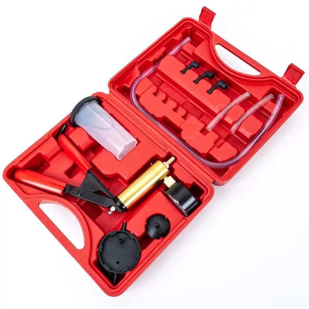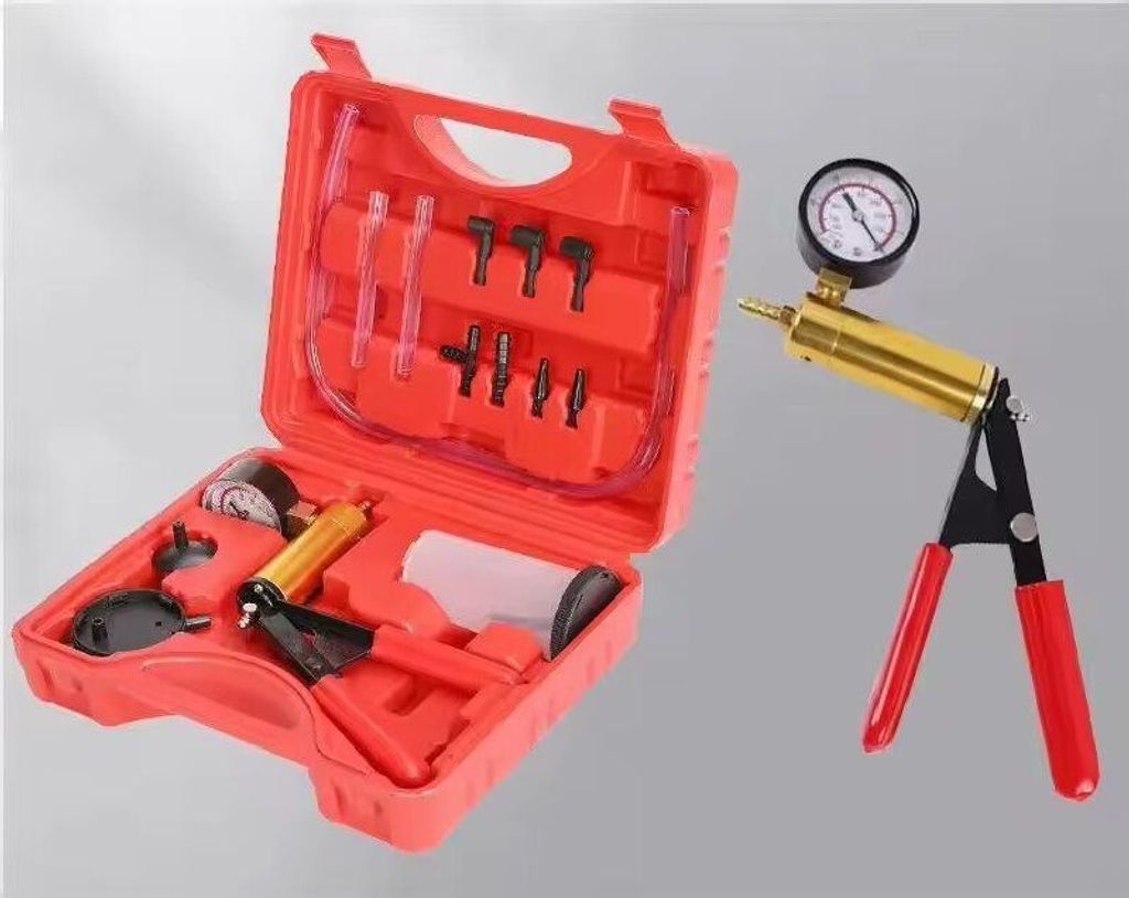 Its appearance is full of professionalism - the red toolbox neatly stores the vacuum pump body, connecting tubes, adapter joints, etc., and the "Hand Pump" logo is clear and distinct. The entire set of tools is compactly arranged, and the red box is portable and easy to carry. Whether it is in the professional workstation of an auto repair shop or in the family garage of a car owner, it can be easily placed and ready for precise detection at any time.