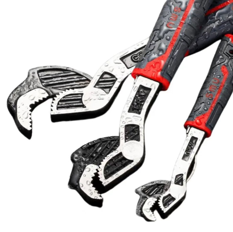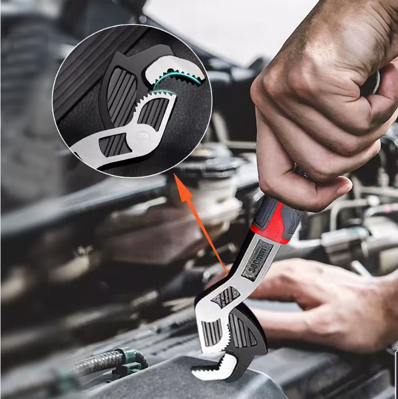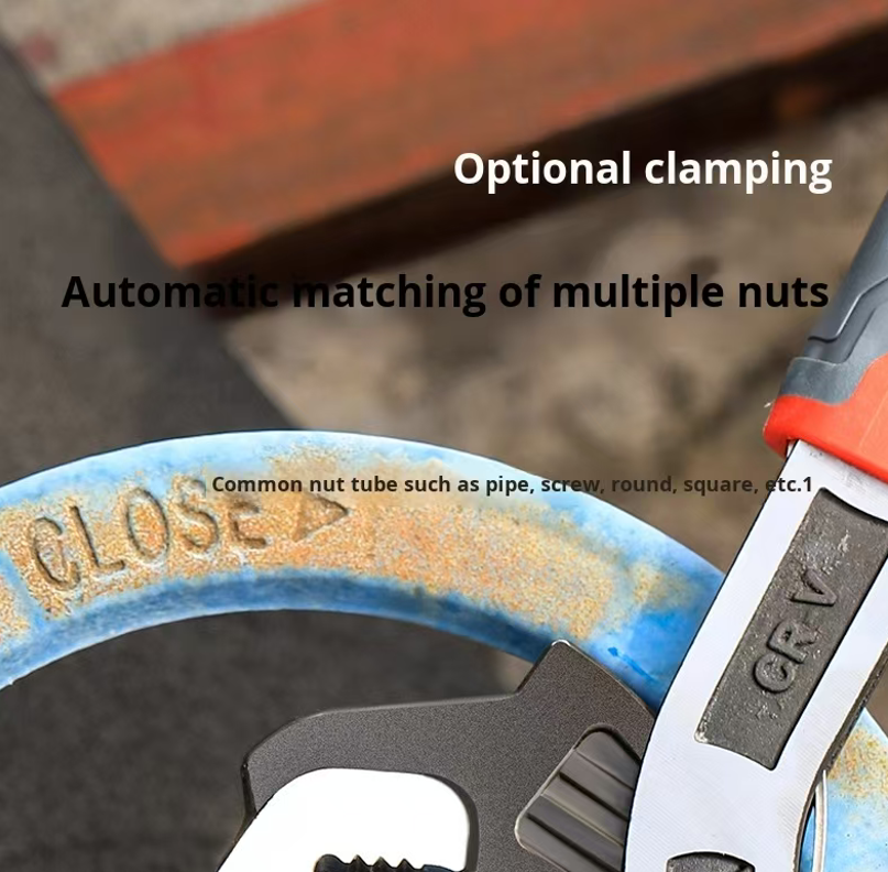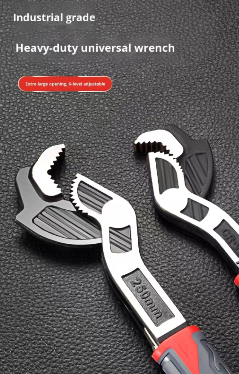 Core self-locking design, say goodbye to the annoyance of slipping! Different from ordinary wrenches that require manual fixation of the opening, this wrench is equipped with a triple serrated interlocking structure, with the interlocking area being three times larger than that of traditional wrenches. Just align the screw and apply gentle force, it will automatically lock and firmly "bite" the workpiece. Whether it's hexagonal screws, square nuts, circular pipe fittings, or irregularly shaped screw holes, it can precisely fit and eliminate the risk of slipping. Especially when dealing with rusted water pipe valves or aging equipment screws, there is no need to use a hammer to strike or have two people cooperate to fix. One person can easily unscrew it with just one operation, and the efficiency is directly doubled.