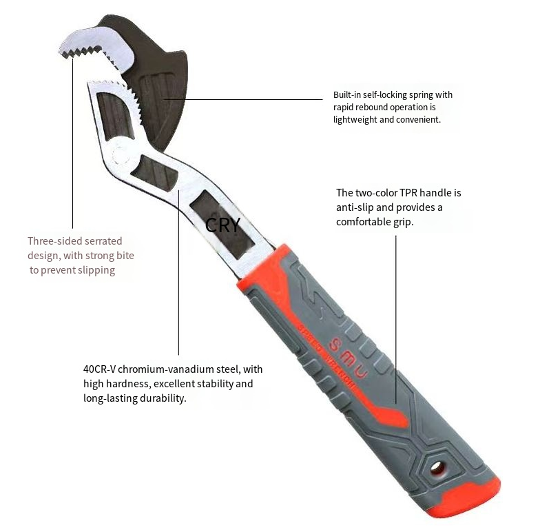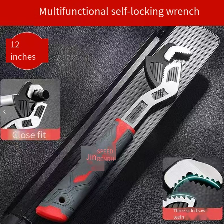 12-inch self-locking adjustable wrench. The three-sided serrated teeth have a strong grip without slipping. The head is hardened to increase hardness and is electroplated with reflective coating for rust prevention. The spring reset is effortless. It is suitable for various scenarios such as water pipes and screws. It can be used as a single tool or multiple tools in one. It is convenient for both household use and maintenance in construction sites.