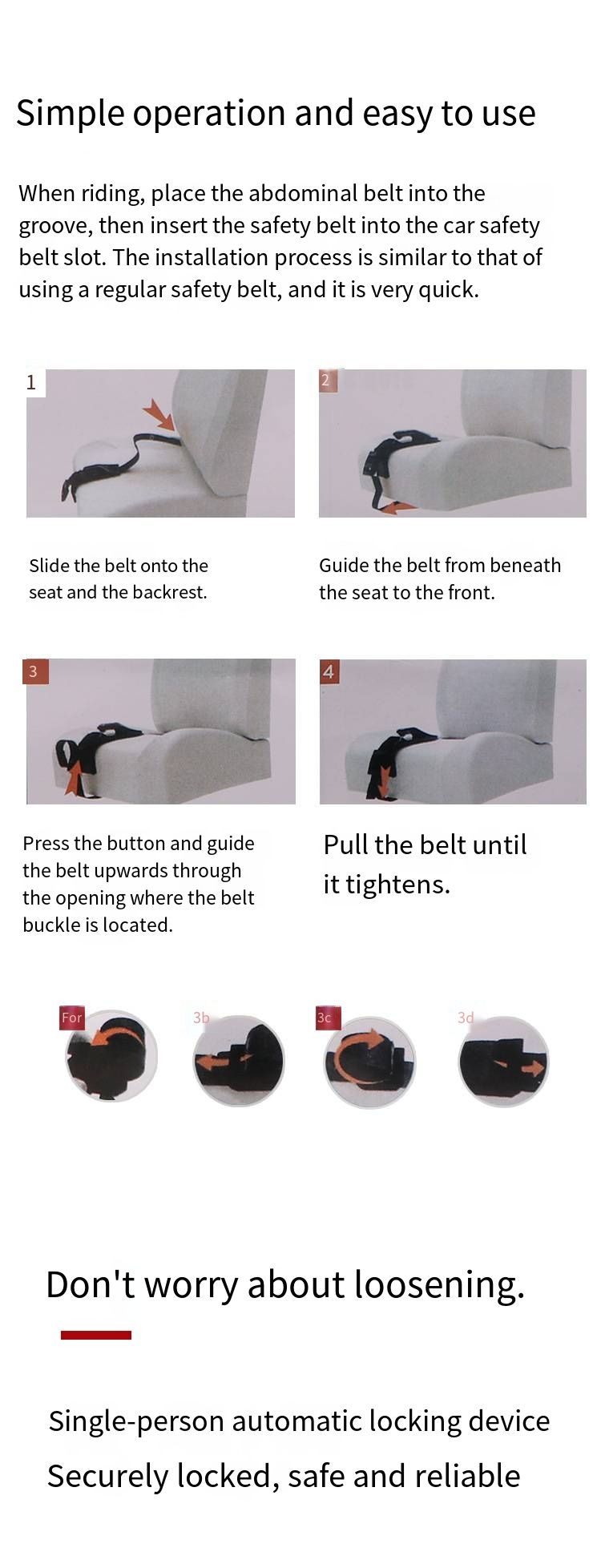 This 2026 upgraded regulator is universal for both the driver and passenger seats and compatible with all vehicle models: high-pressure-resistant material + abdominal support design, transferring the pressure of the seat belt to the legs, completely avoiding the abdomen; black belt and white shell, simple and durable, installation only requires 3 steps, and it can be securely fastened with just one buckle and one clip.