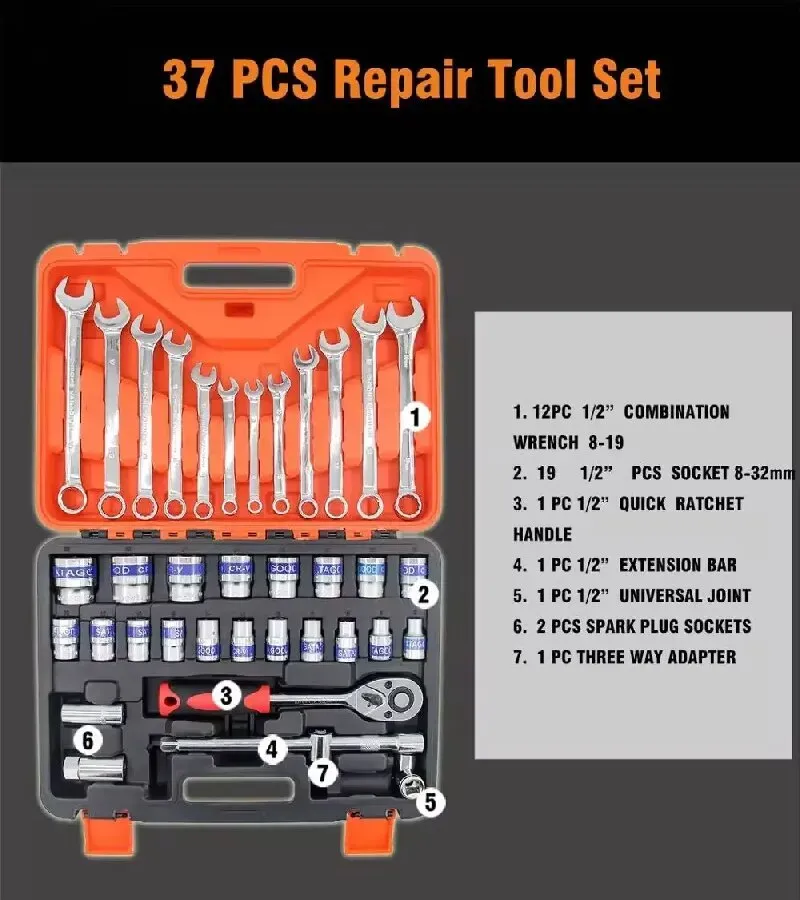 37-piece repair tool set, including 12 wrenches (6-19mm), 19 sockets (3-24mm), and quick wrenches and other accessories, suitable for various scenarios. The tools are made of high-strength steel for rust prevention and durability, and the quick wrenches are easy to operate and save effort. This set can be used by renters, car owners, and DIY enthusiasts, and can handle most repairs.