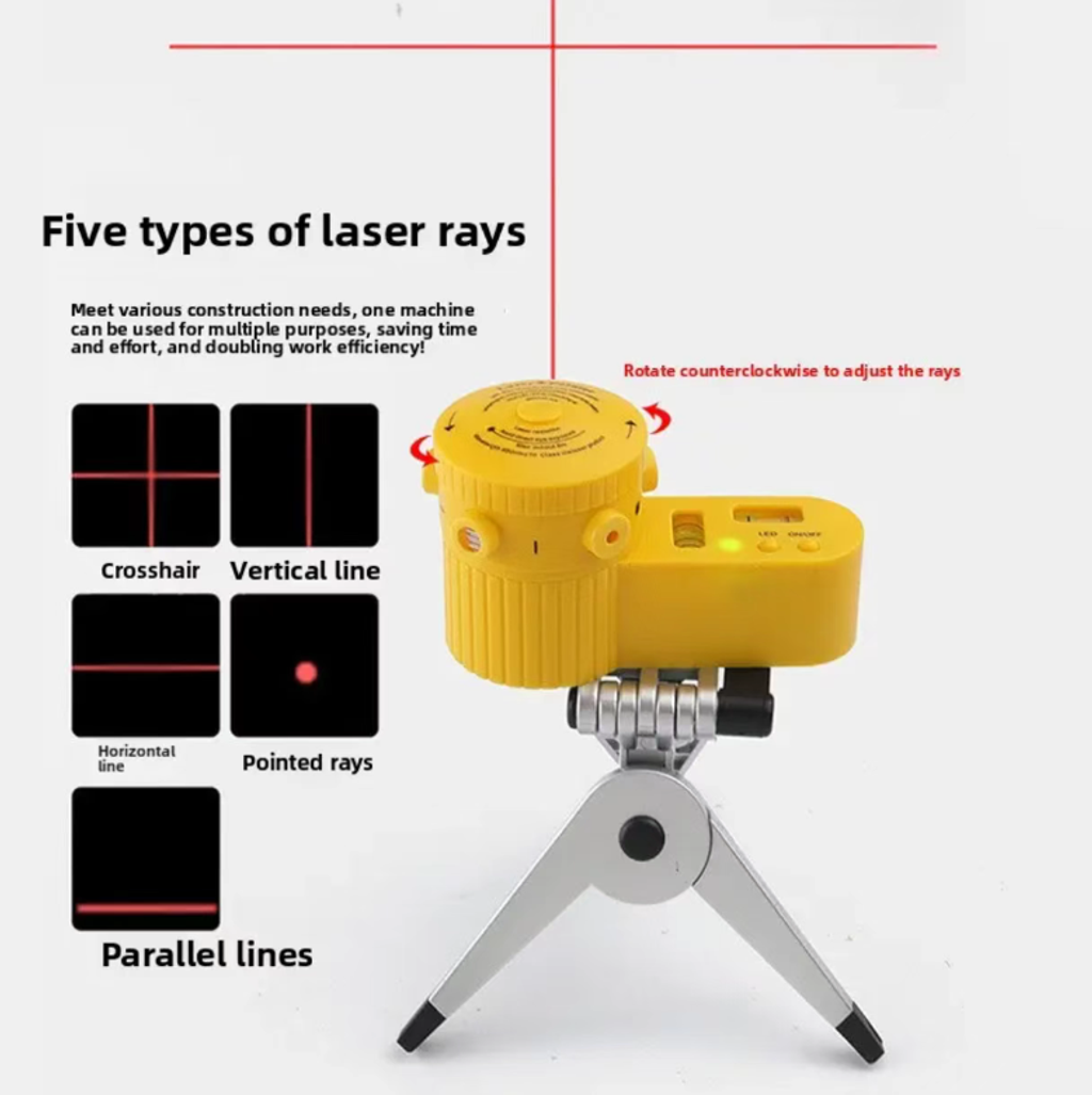 5-in-1 Laser Leveling Instrument, featuring 5 laser modes including cross, vertical, and water level. It can precisely level surfaces for tiling, framing, and hanging decorations. The detachable modular design with a clamp on the stand allows for easy portability and stable fixation. The bubble level and LED light are included. Even in low light conditions, it can be used. Lightweight and durable, essential for decoration or DIY projects!