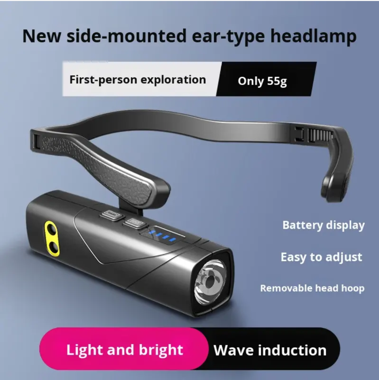 55g Side-mounted Headlamp,Lightweight like an earphone, not heavy on the head. Side-mounted, handheld, can clip onto the brim of a hat for multi-scenario compatibility. With gesture control switch for hands-free operation. High-brightness LED + battery level display. Free your hands without hindering your actions. Must-have lightweight equipment for outdoor enthusiasts and night workers. Once you use it, you'll be hooked!
