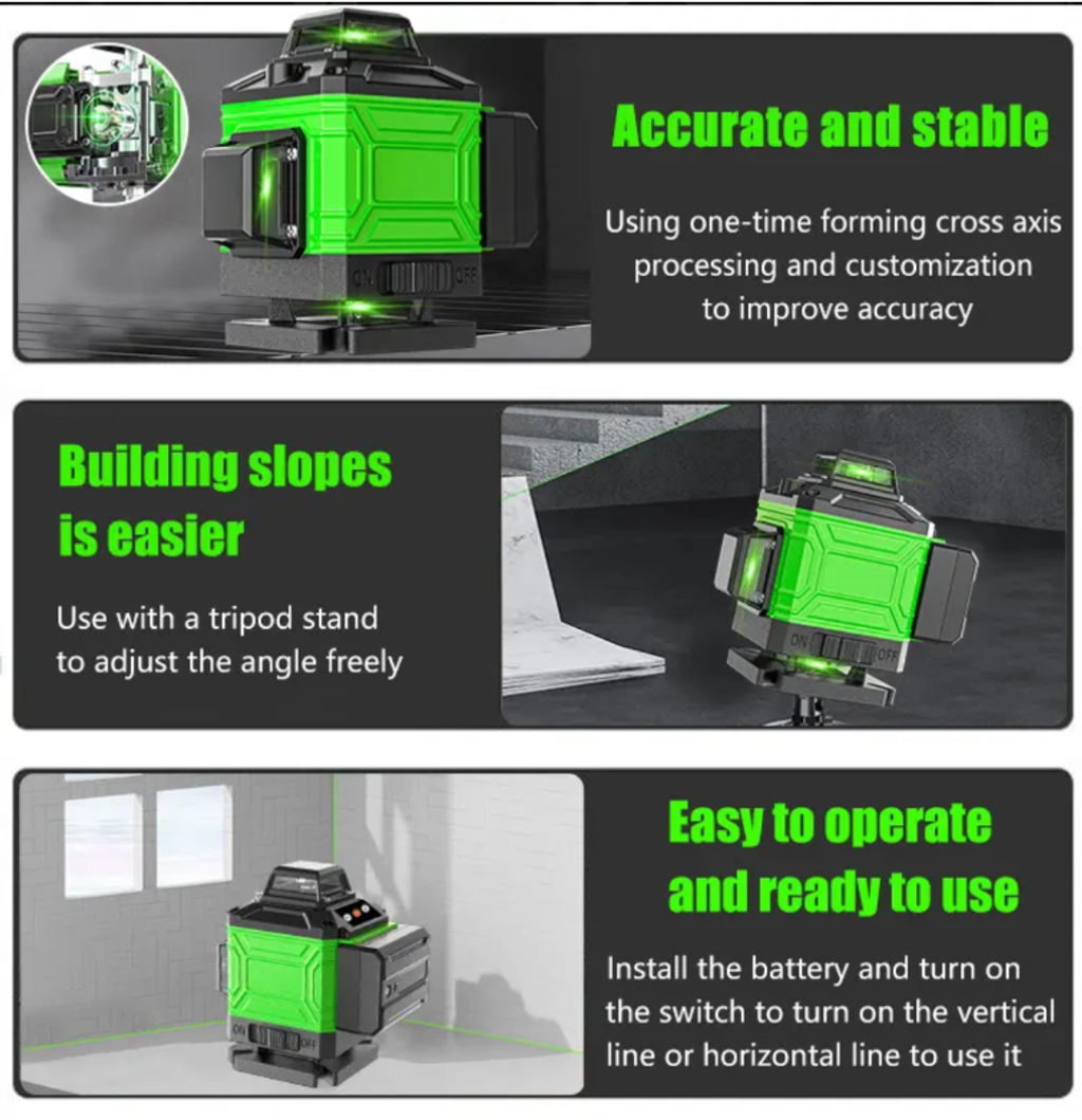 It employs green light laser technology. Compared to the traditional red light, green light has better visibility in bright environments. Even in outdoor strong light or indoor complex lighting conditions, the green laser lines can be clearly seen, allowing construction workers to easily capture precise reference lines. It also has an automatic leveling function. After startup, it can quickly adjust to the horizontal or vertical state automatically, eliminating the need for repeated manual adjustments, significantly improving construction efficiency.