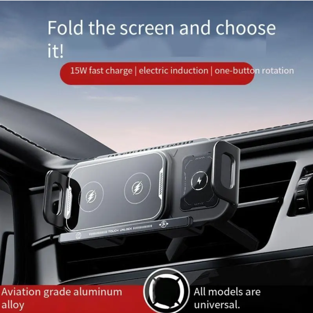 A dedicated car-mounted wireless charging stand for foldable screens, featuring 15W fast charging and super capacitor technology. It can be opened and closed electrically with one click and supports horizontal and vertical screen switching. Made of aviation aluminum, it is compatible with all foldable screen models. It clamps firmly without damaging the device and is an efficiency-enhancing must-have for foldable screen users for car charging and navigation.