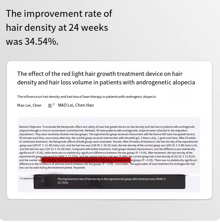 It is equipped with 176 660nm red light LEDs + 352 850nm near-infrared light chips (a 3-in-1 efficient design), which can deeply penetrate the scalp and precisely reach the hair follicle roots - just like installing an "energy pacemaker" for dormant hair follicles, activating the atrophied hair matrix cells, and enabling the "slumped" hair follicles to re-enter the growth cycle. Clinical data has confirmed that after consistent use, both the number and density of hair strands have improved in both directions. 80.95% of users have achieved hair loss relief, and the hair volume has become noticeably thicker!