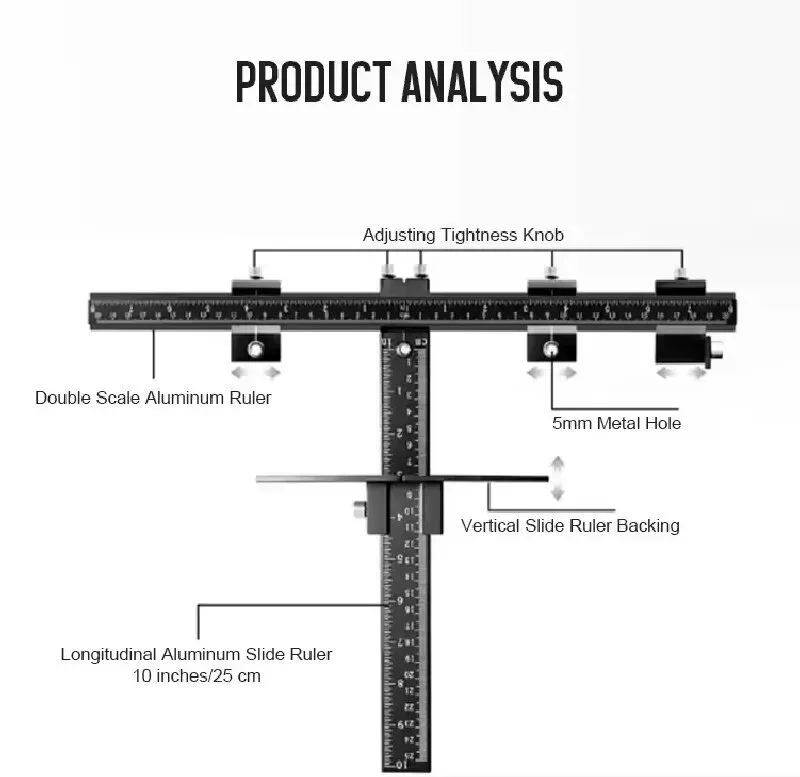 It is made of 3 times harder aluminum and its edges are rounded for safety. It won't hurt your hands or scratch the surface of the furniture. The cross double-scale design ensures precise markings of both horizontal and vertical directions, down to millimeters. Combined with the sliding positioning blocks, it can lock the drilling position for drawer handles, cabinet door handles, or door locks - eliminating the need for repeated measurements and incorrect marking.