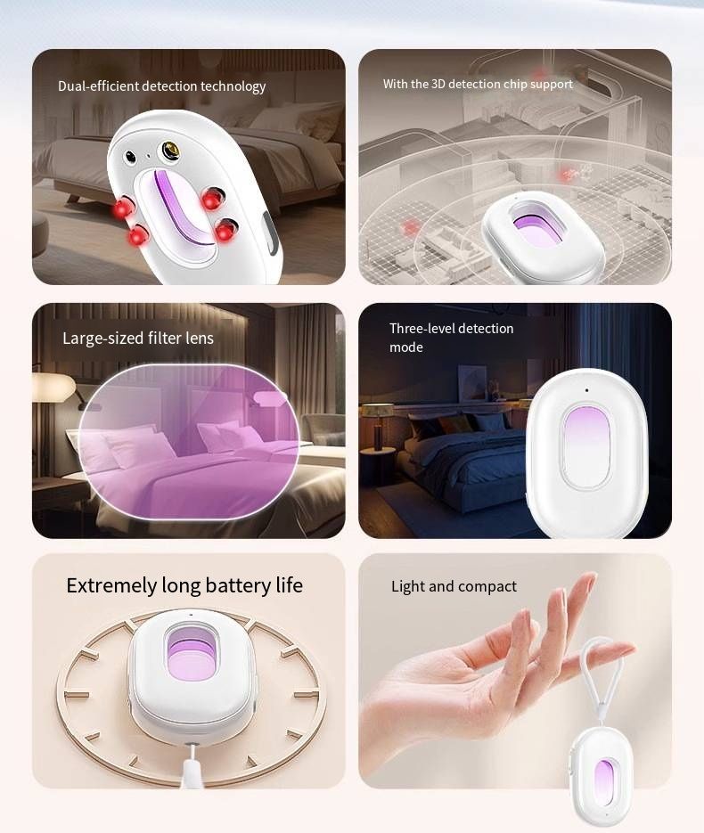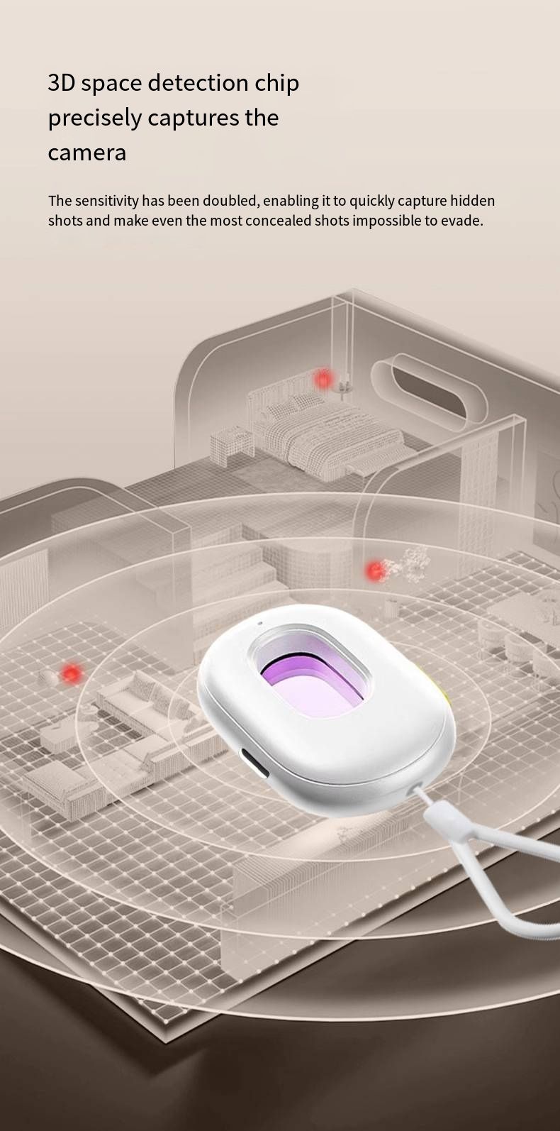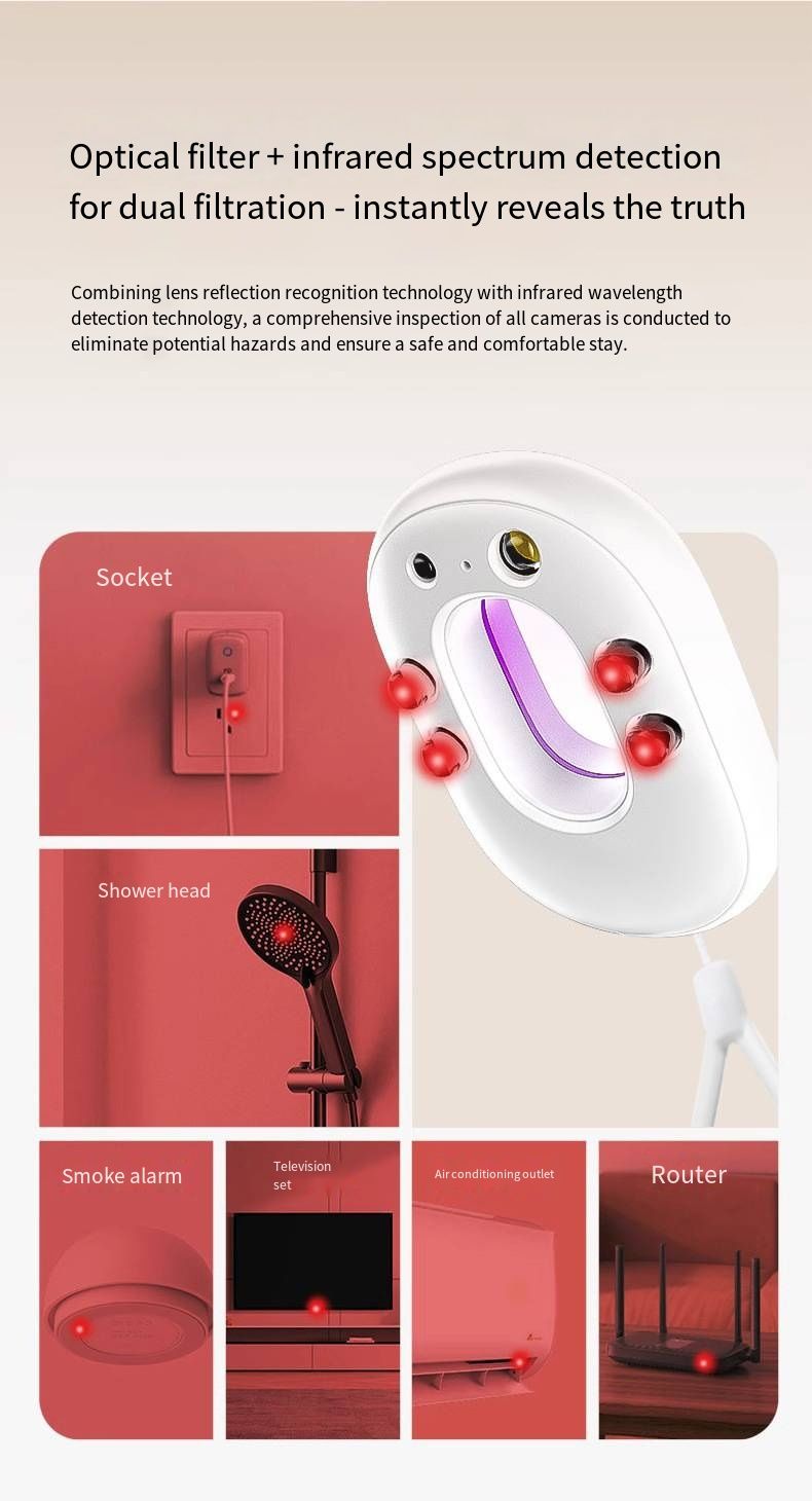 All-scenario privacy protection portable all-in-one device integrates both optical filter lens and infrared spectrum technologies, accurately detecting hidden pinhole cameras in sockets, shower heads, smoke detectors, and household appliances, providing 360-degree privacy protection. It can switch between three intelligent modes flexibly, adapting to different lighting conditions in various usage scenarios. The strong light mode enhances recognition, while the weak light mode offers energy-saving and long-lasting monitoring. It is equipped with a highly sensitive vibration sensing module