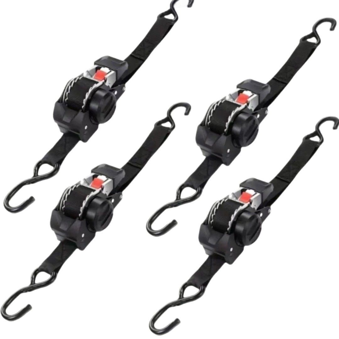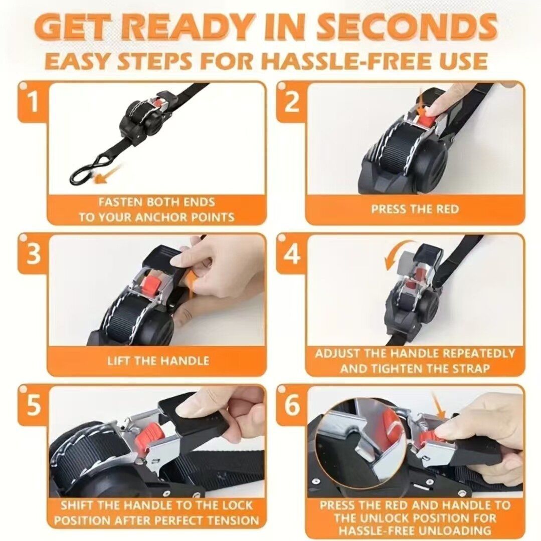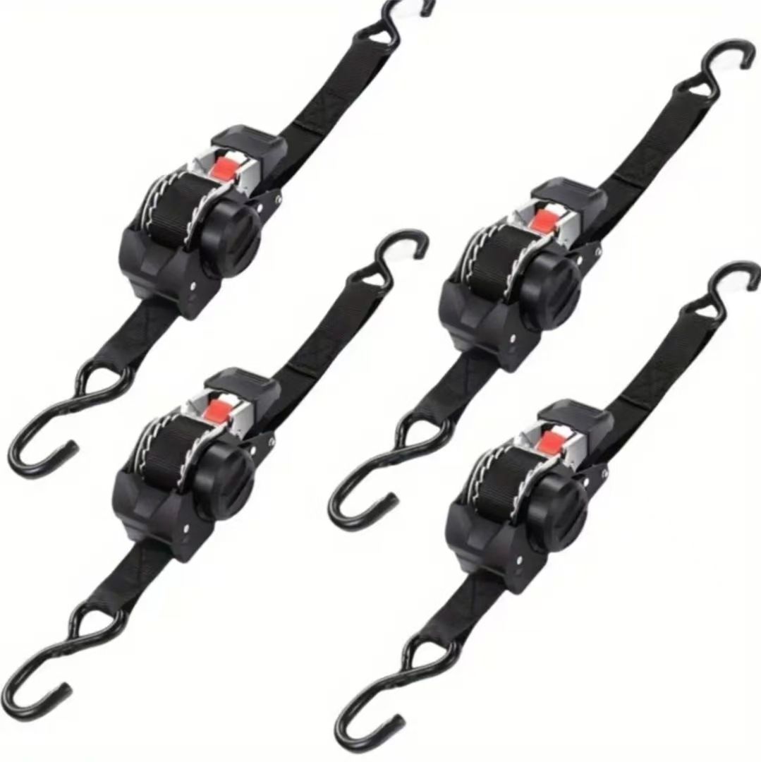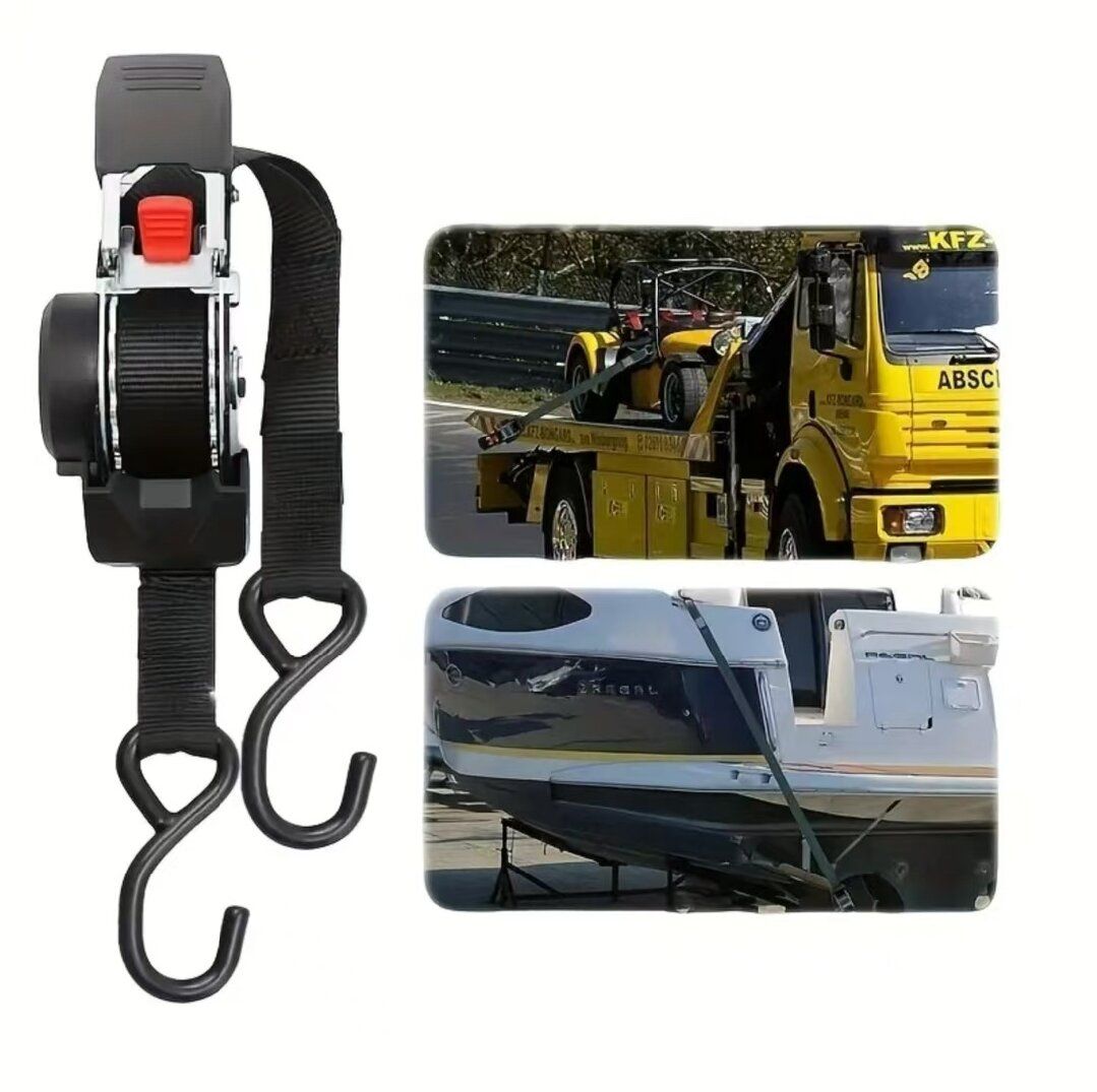 This automatic recapturing ratchet binding strap is 3 meters long and 2.55 cm wide. It features double S hooks + rubber-coated safety buckles, providing secure locking without slipping. It can be quickly tightened by a gentle pull, and the red button can be pressed to release the strap instantly. The strap is automatically recycled, saving space. It is suitable for fixing cargo on pickup trucks / vans, motorcycles / ATVs, warehouse goods, for自驾 trips and outdoor transportation. The high-tensile fabric strap is wear-resistant and tear-resistant. The self-locking design ensures transportation safety. This set solves the problem of loose cargo and is a practical equipment for car owners and outdoor enthusiasts.