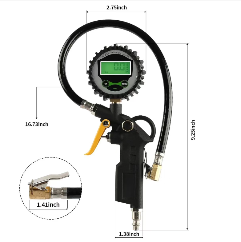 High-precision digital pressure gauge, with a wide range of 0 - 200 PSI and an accuracy of 0.05 kg cm². It can be switched between four units with one click. The bright LCD backlight screen, gun-shaped non-slip grip, and explosion-proof hose, along with rubber protection for shock resistance and durability, make it a professional tool for auto repair, off-road driving, and outdoor inflation pressure measurement.
