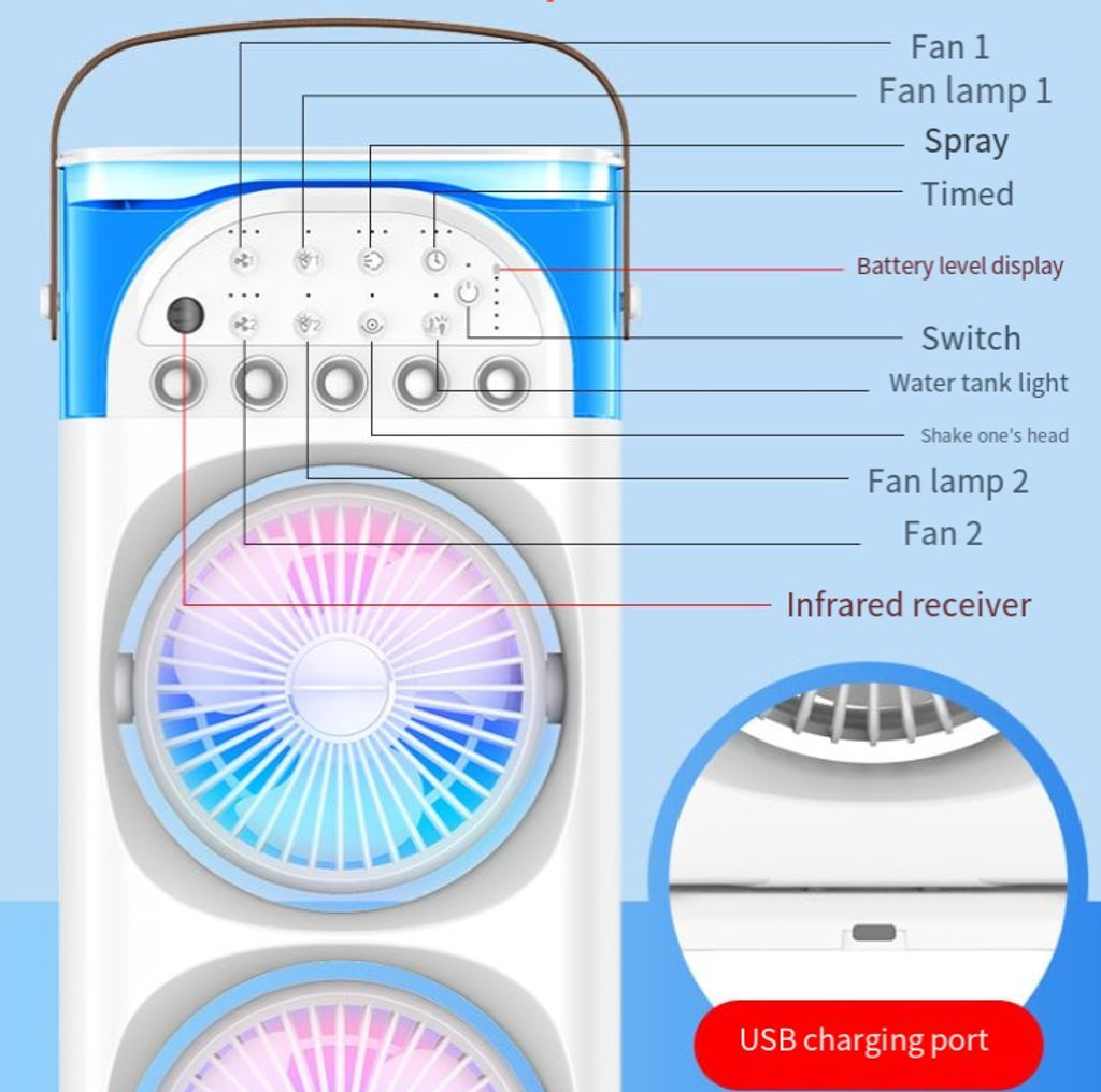 When the scorching heat of summer rolls in with a heavy, oppressive atmosphere, do you still feel frustrated by the traditional fan's inability to cool you down while merely blowing air? This five-hole cooling ice mist fan, which combines the freedom of charging, the convenience of remote control, and the ability to blow air in a swaying motion, will unlock the most "cooling" summer cooling experience for you, making every breath feel refreshing.