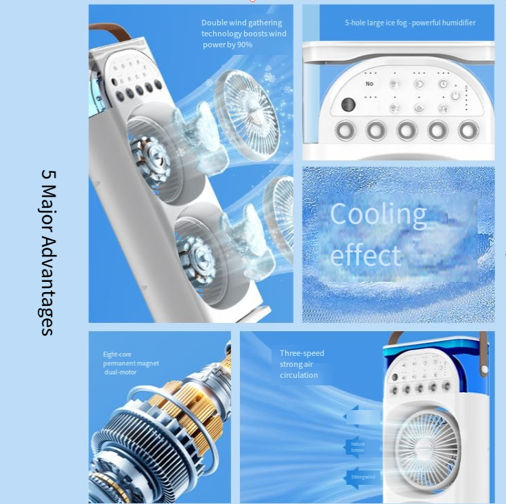 This summer, don't let the heat waves control your emotions! This 【charging + remote control + swivel】five-hole cooling ice mist fan, with "ice mist cooling + wireless freedom + intelligent control" all-round performance, creates a personalized cooling barrier for you. Whether you are a quality-oriented urban professional or a trend-driven outdoor explorer, it can become your "cooling companion" in summer, allowing you to be calm and elegant in the scorching heat and fully enjoy the wonderful time of coolness and comfort.