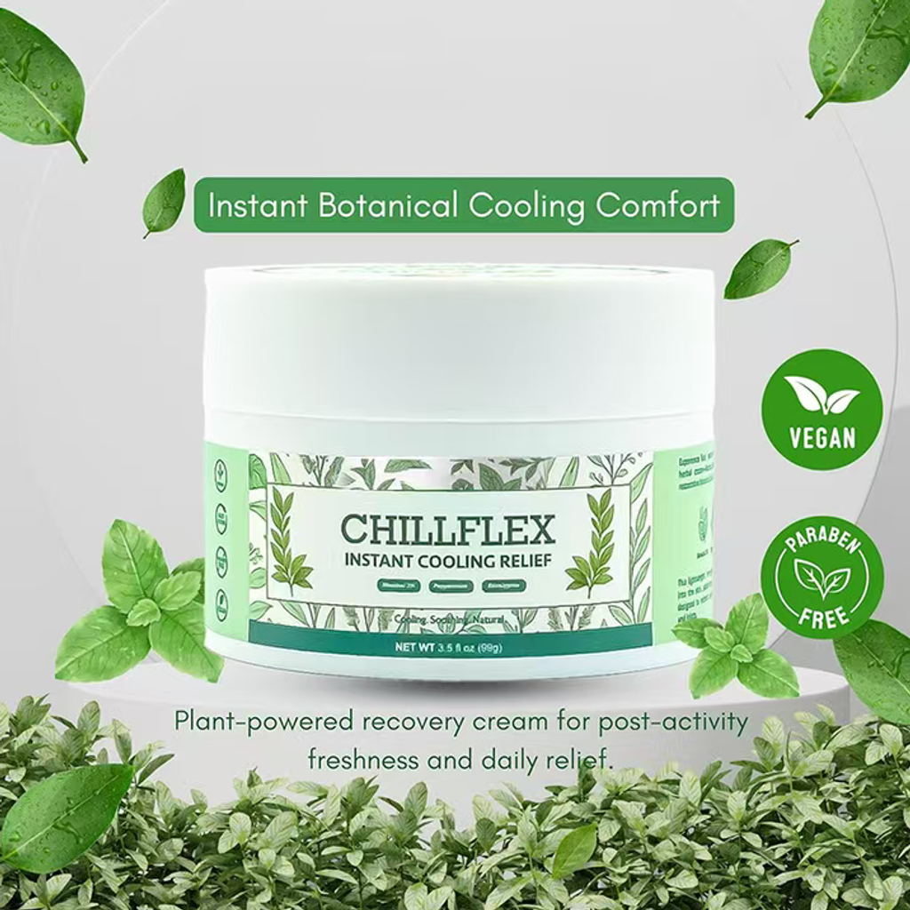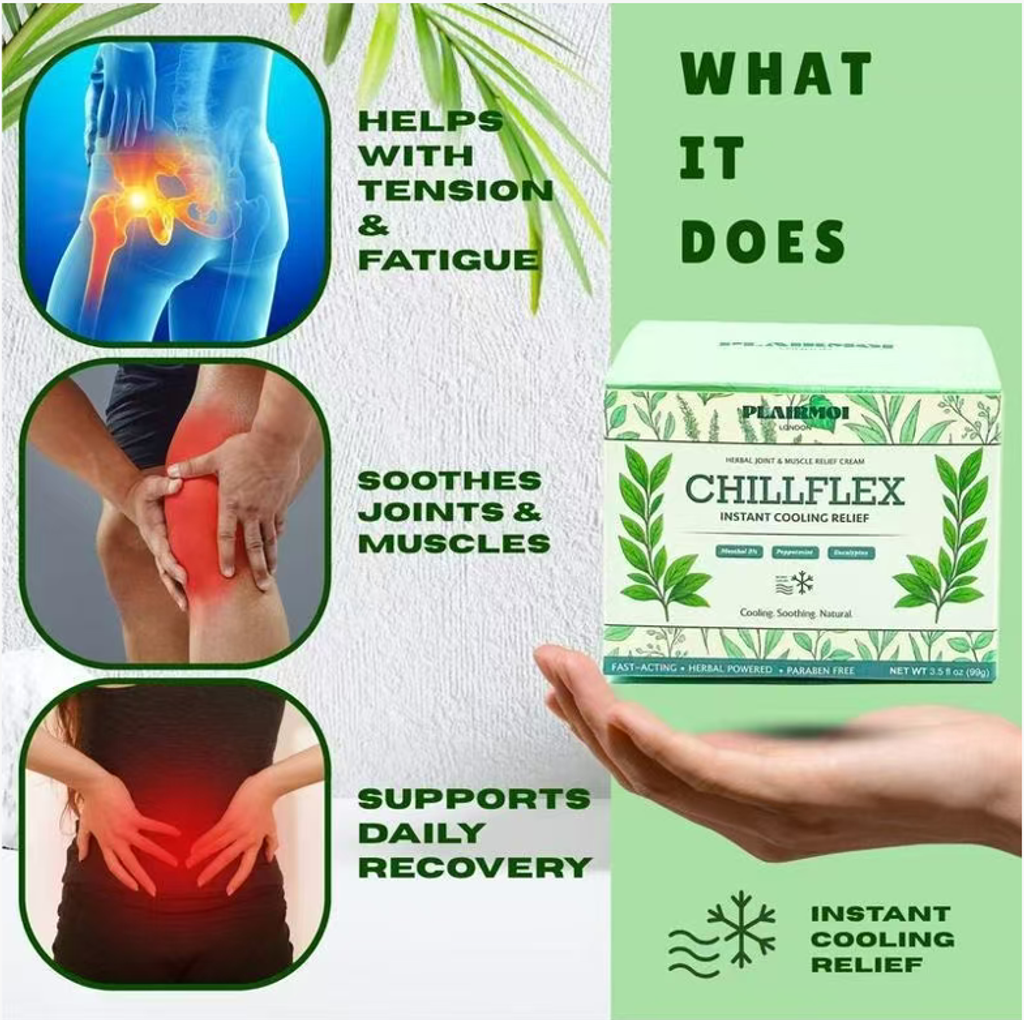 CHILLFLEX Plant Soothing Cooling Cream, with a plant-based formula, provides instant cooling and refreshing relief. Suitable for both post-workout rejuvenation and daily relaxation. Order today and receive 4 bottles as a gift. Use in the morning and evening. This product effectively relieves joint and muscle pain, restores flexibility, comfort, and vitality. Make the purchase now and let the power of herbs become your recharge station for both body and mind!