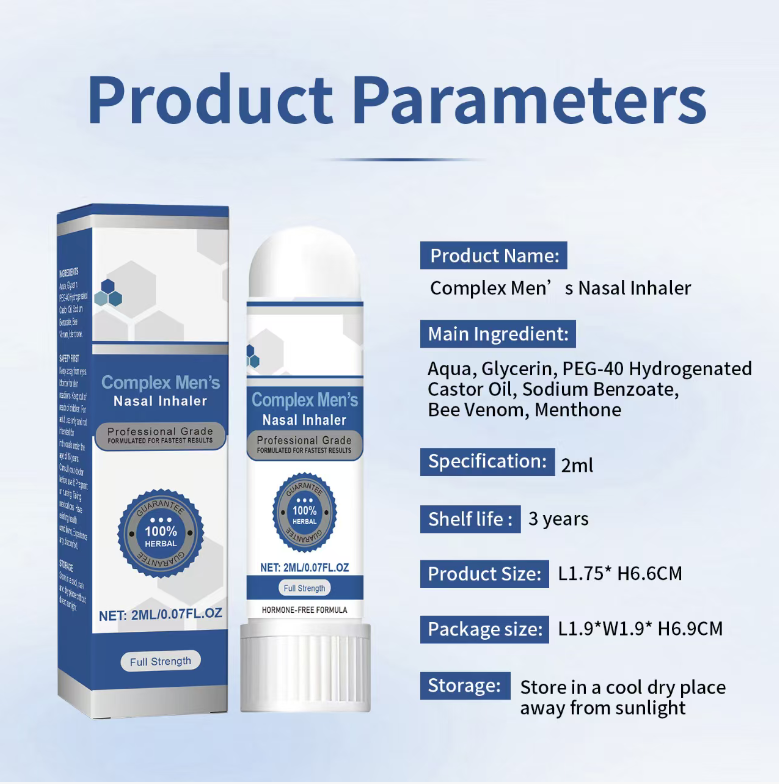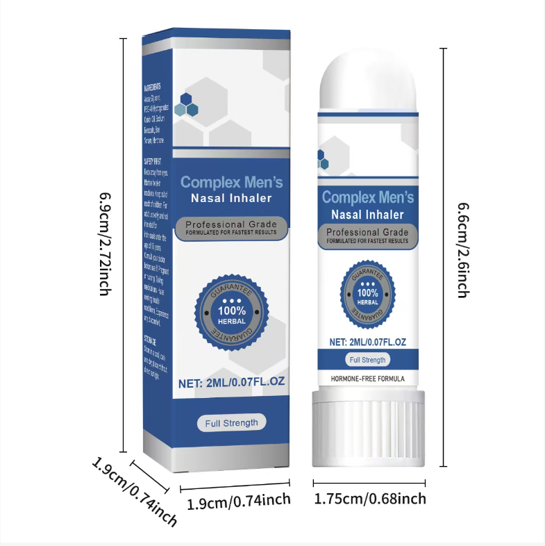 This nasal inhaler is a professional-grade product. The formula has been meticulously developed to achieve the fastest results. It uses 100% natural herbal ingredients without hormone additives, is safe and gentle, allowing men to use it with confidence. Each nasal inhaler has a net content of 2ML/0.07FL.OZ, with concentrated and highly effective essence, which can take effect quickly.