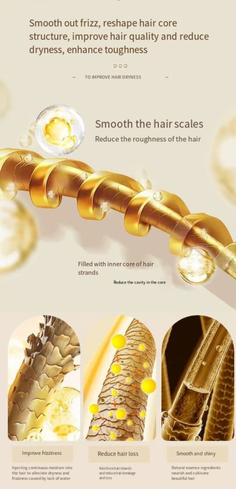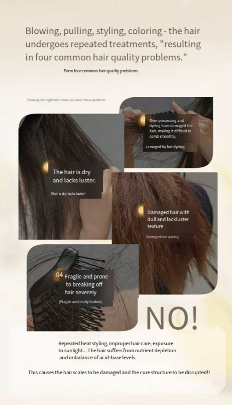 Repair fibers: Fills in the damaged gaps in the hair core, gradually smoothing out the damage from styling;