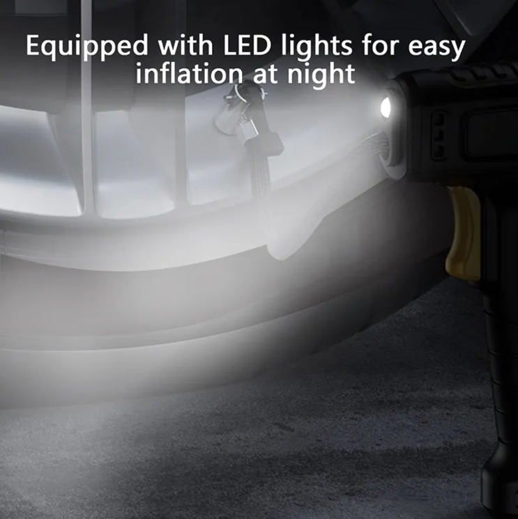 Handgun-style digital display on-board air pump. The pistol-style design is easy to operate. The large digital screen precisely presets tire pressure and stops when fully inflated. The high-speed motor inflates quickly. The LED lights are convenient for use at night. Carry it for self-driving, ensuring tire pressure is always in order, and you can set off with peace of mind.
