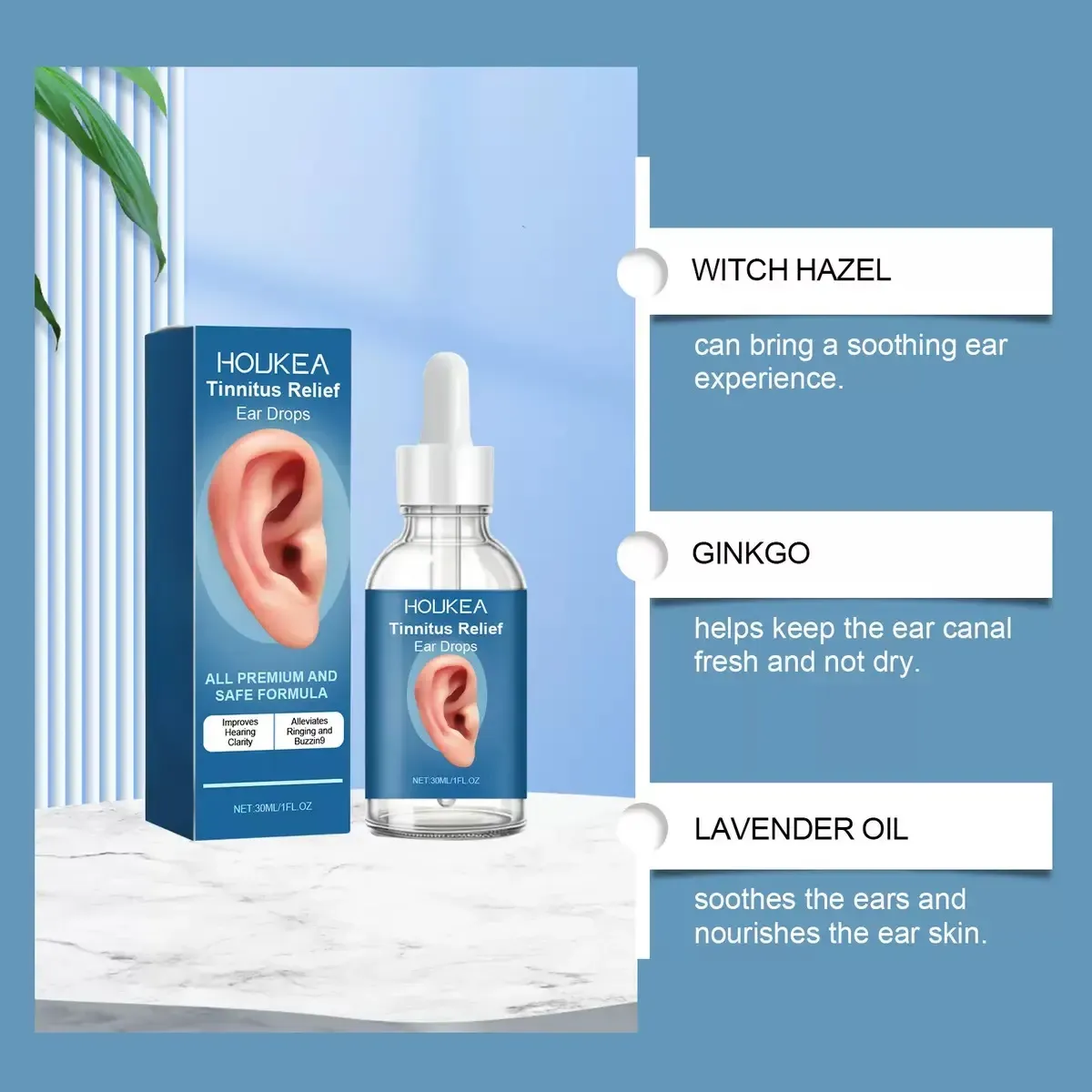 It is centered around the essential oils of witch hazel, ginkgo, and lavender. Witch hazel gently soothes the discomfort in the ear, ginkgo keeps the ear canal always fresh and not dry, and lavender oil nourishes the ear skin while soothing - the three work together to transform "discomfort" into "comfort".