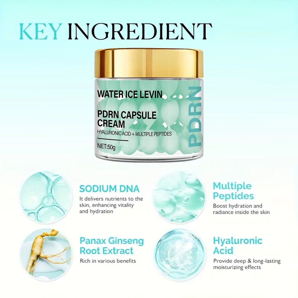 WATER ICE LEVIN PDRN Capsule Cream, featuring PDRN as the core rejuvenating ingredient, combined with hyaluronic acid and multiple peptides, in synergy with DNA sodium, ginseng root extract, deeply hydrates, soothes dryness, and helps enhance skin elasticity and firmness. The texture is refreshing and not heavy, easy to spread on the skin, absorbs well, leaving the skin moist without being sticky. It is suitable for use in the morning and evening. Consistent use over time can improve roughness and dullness, allowing the skin to present a delicate, bright, and lustrous water-like appearance. It is an ideal choice for daily moisturizing and repair.