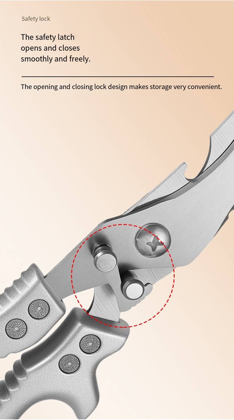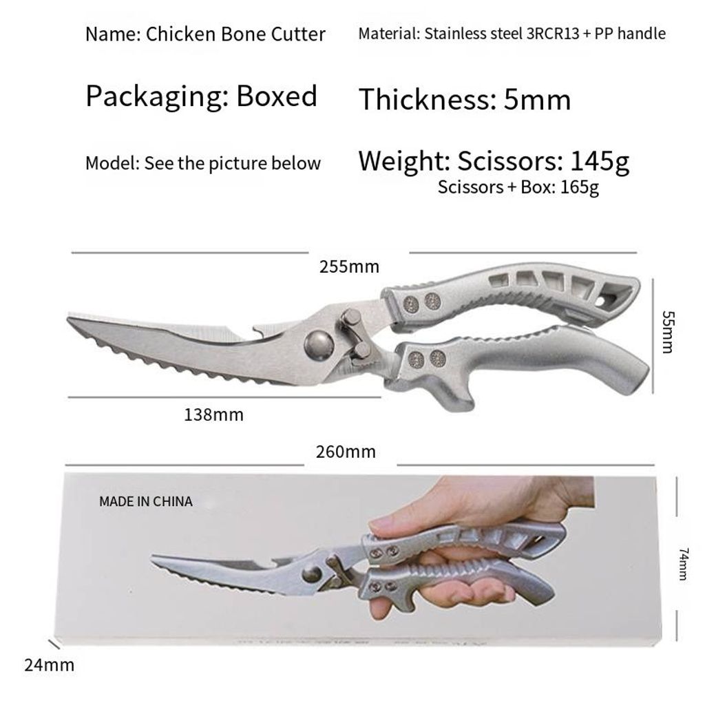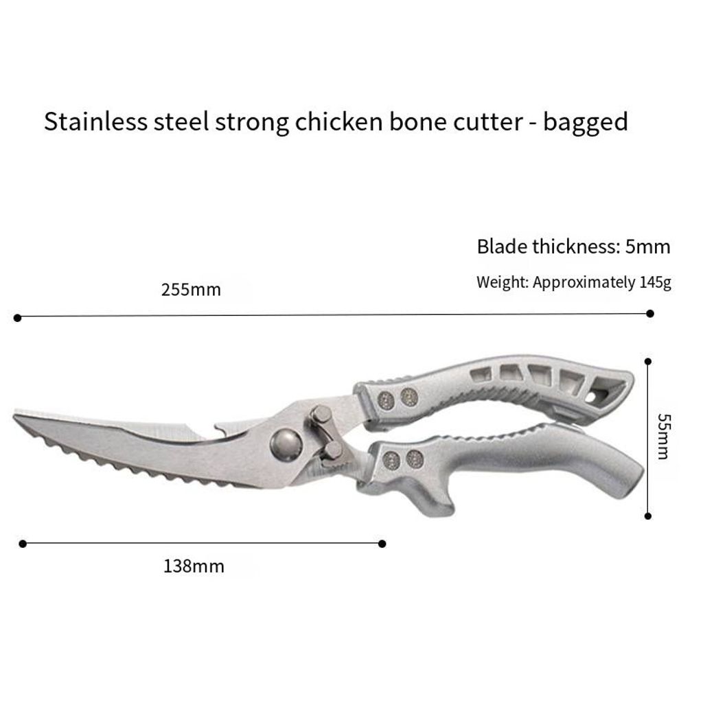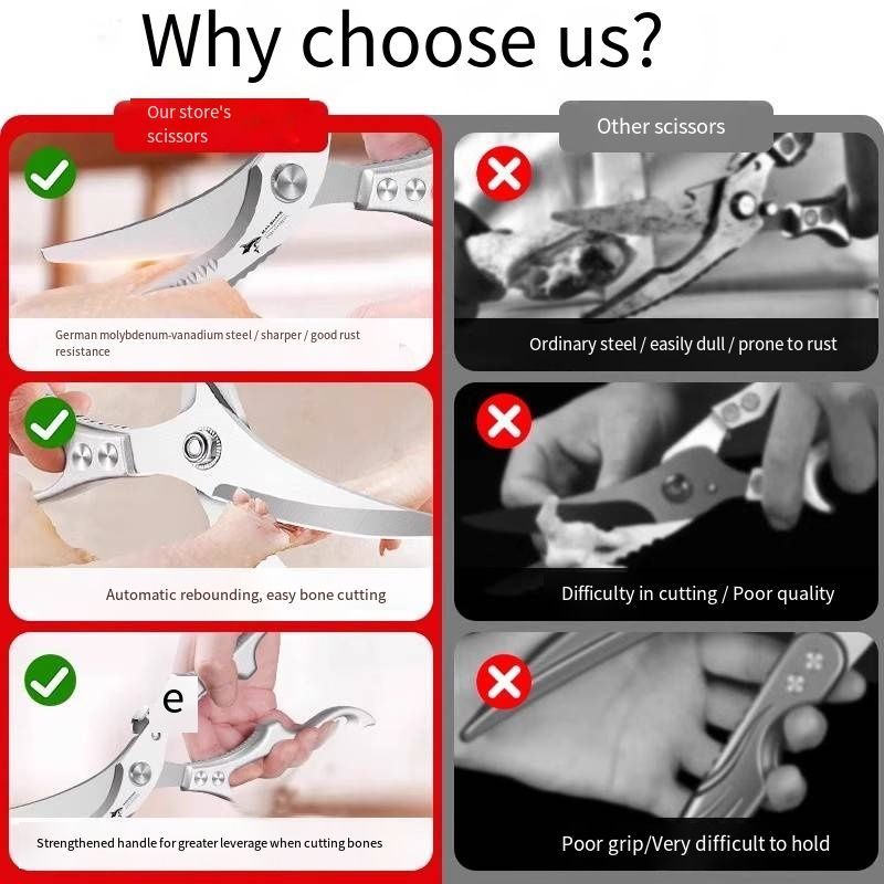 Are you tired of struggling to cut chicken bones with ordinary scissors and worrying about them getting dull quickly? This multi-functional strong scissors solves all these problems directly! Made of German molybdenum vanadium steel, it is rust-proof and sharper, and won't become dull even after long use. It comes with an automatic rebound design and is paired with an enhanced lever anti-slip handle. When cutting chicken bones, it saves you a lot of effort and makes the cutting much easier without the need for brute force. The handle is anti-slip and durable, providing a stable grip without slipping. It is suitable for all kinds of heavy kitchen tasks. Compared to ordinary scissors which are fragile and prone to breakage, it is durable and sturdy, making it a must-have tool for handling tough ingredients. It makes cooking bone-cutting and dish-preparation more efficient and worry-free.