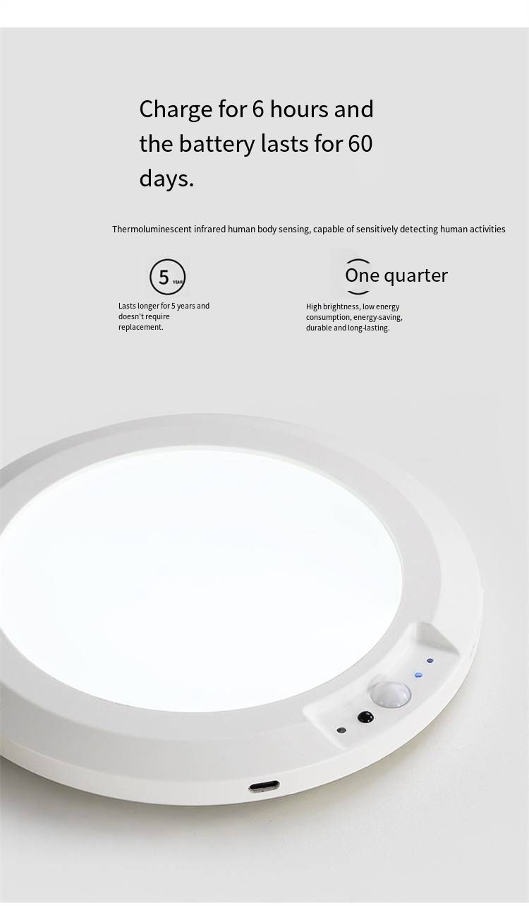 Intelligent Wireless Human Detection Ceiling Lamp: Say goodbye to wiring hassles. USB charging, portable installation, dual sensors sensitively detect human movement. Lights up instantly in 0 seconds, with 6-hour full charge providing 60 days of illumination. Sensory lighting with high color rendering. Mosquito repellent property added. Compatible with various living spaces.