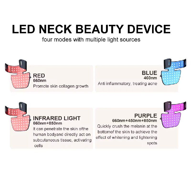 LED Neck and Shoulder Phototherapy Beauty Device: Four modes with multiple light sources (red, blue, infrared, combined purple light) precisely address neck wrinkles, slackness, dullness, and acne-prone areas. 660nm red light promotes collagen production. 850nm infrared penetrates deeply to rejuvenate the skin. 460nm blue light reduces inflammation. Ideal for at-home portable care, allowing you to easily achieve a smooth and fine neck like a swan's neck.