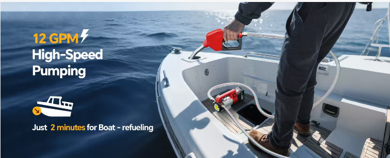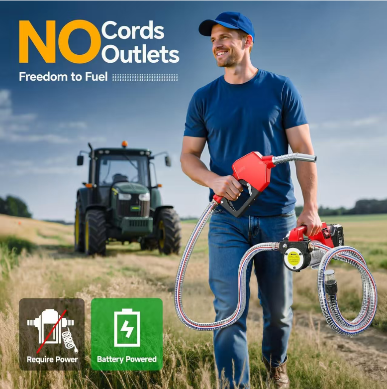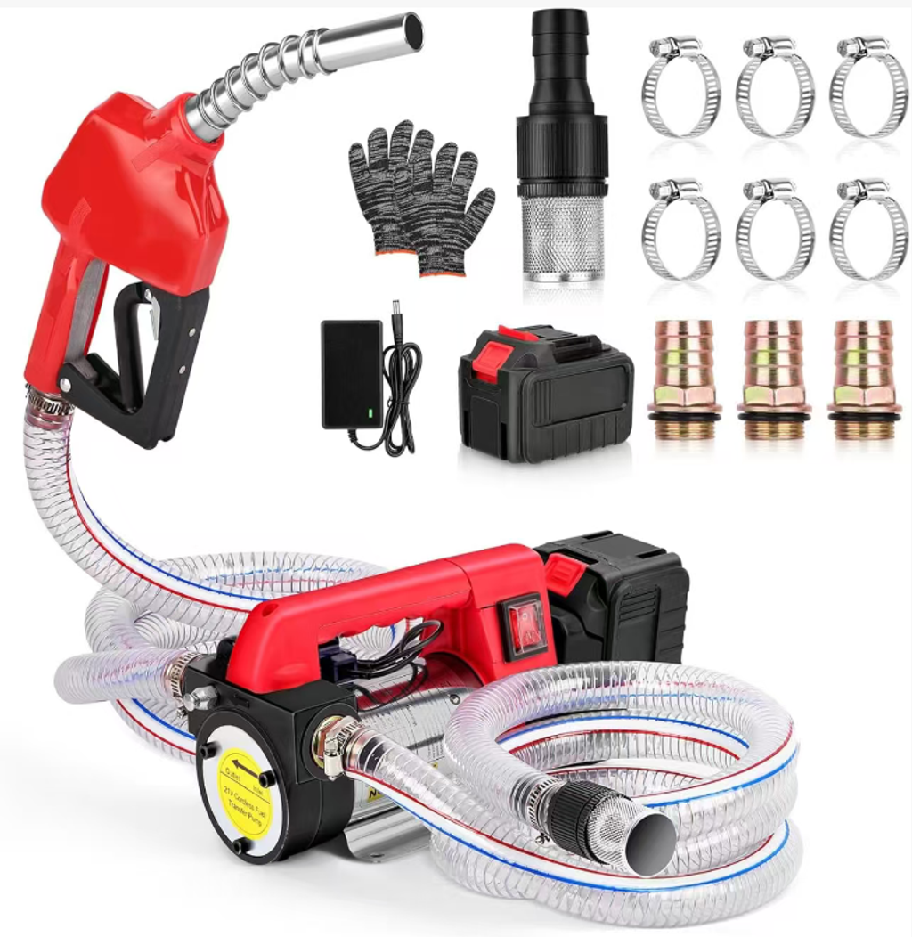 Unpowered fuel transfer pump. Equipped with a sturdy and durable nozzle, an automatic shut-off device, a 15-foot long hose, and a filter to keep the fuel clean. It can transfer up to 12 gallons of fuel in less than 30 seconds, enough to empty a 5-gallon container completely. This kit comes with a 4-amp battery and charger, allowing you to use it at any time. So this thing is amazing. Click on this video and get it right now! Because on the Temen platform, it's very affordable.
