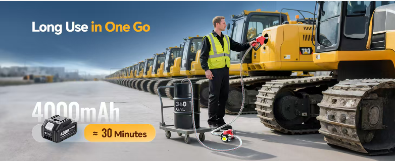 It has a built-in 4000mAh battery. After a single charge, it can work continuously for about 30 minutes, easily filling 25GAL or 55GAL large-capacity oil cans. Outdoor operations no longer require frequent searches for power sources, and the battery life is very powerful.