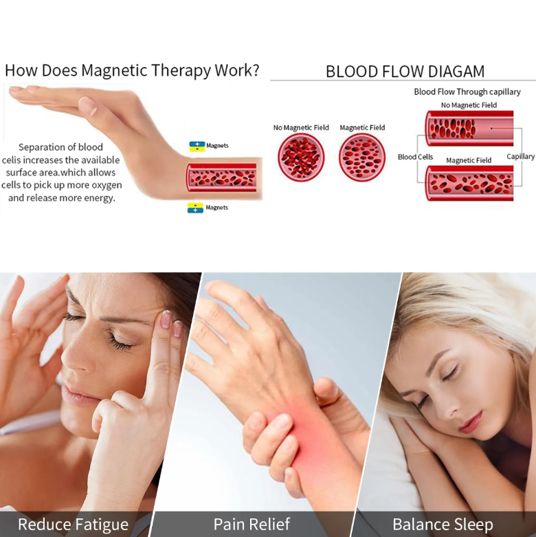 It contains multiple high-purity magnets that are in line with the distribution of wrist acupoints. Through the gentle magnetic therapy effect on the skin surface, it assists in promoting blood circulation and relieving muscle fatigue: