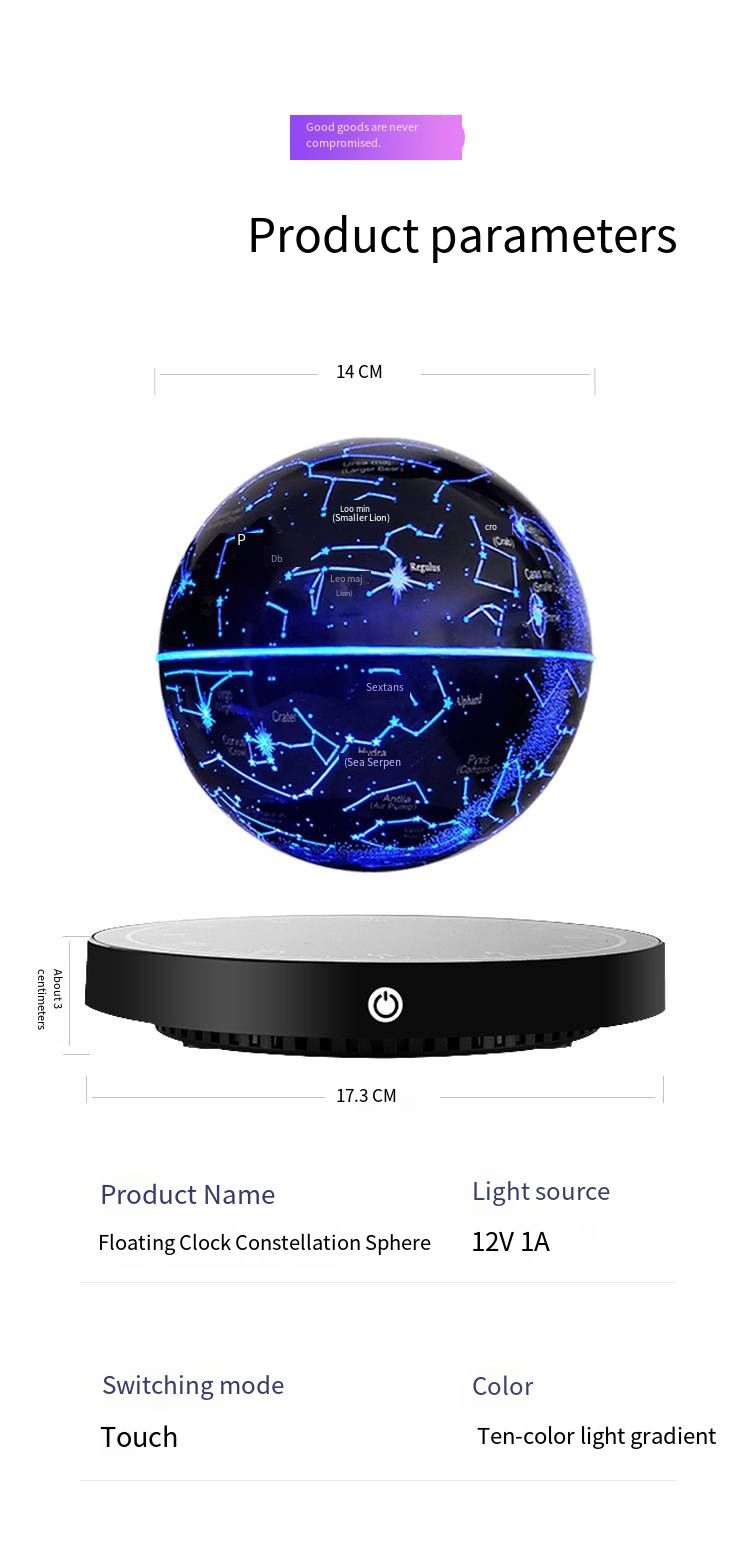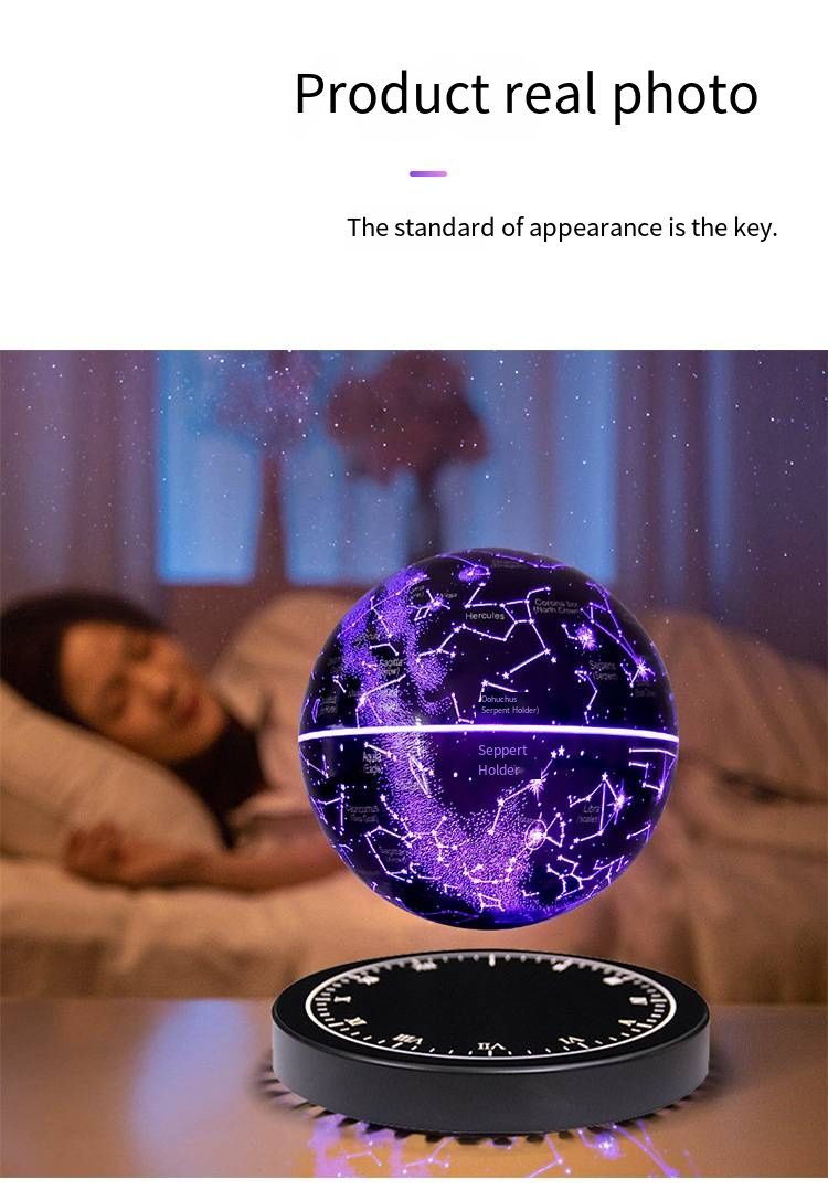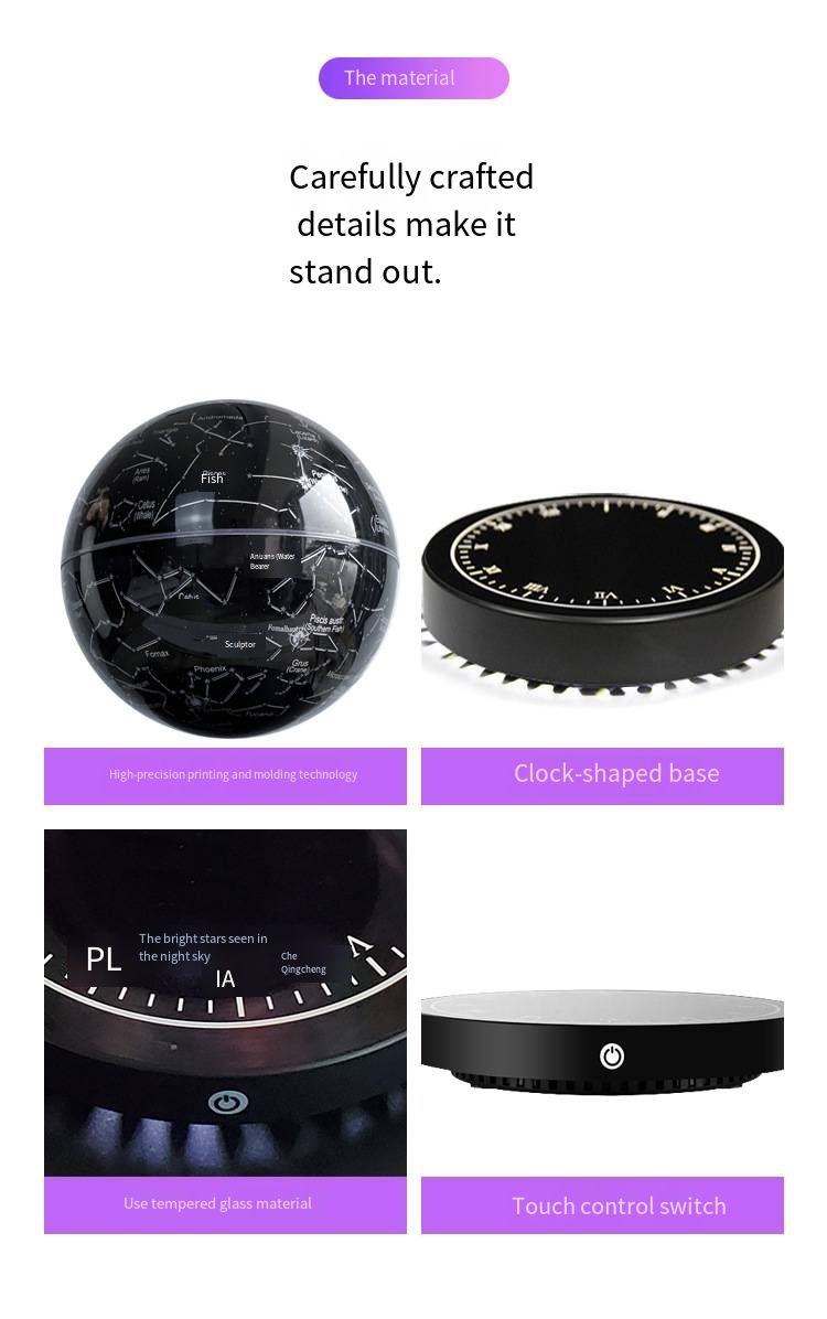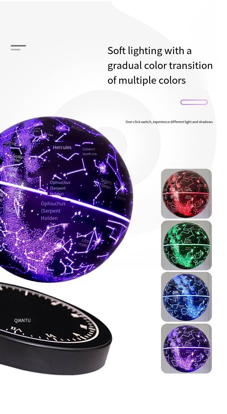 Magnetic levitation luminous globe. Suspended and rotating magnetically. The spherical surface is engraved with constellation patterns. It has four colors of lights: red, green, blue, and purple. When lit, it resembles a miniature galaxy. It can be used as a decorative item as well as a small night light. The base has markings. It rotates 360° to clearly view the constellations. Hold the starry sky in your palm. Your daily space instantly transforms into an observatory!