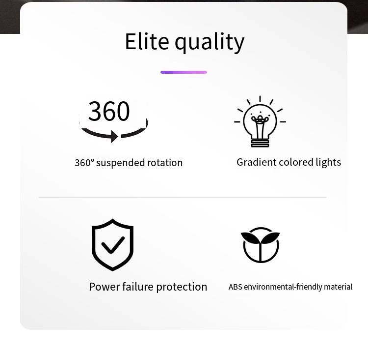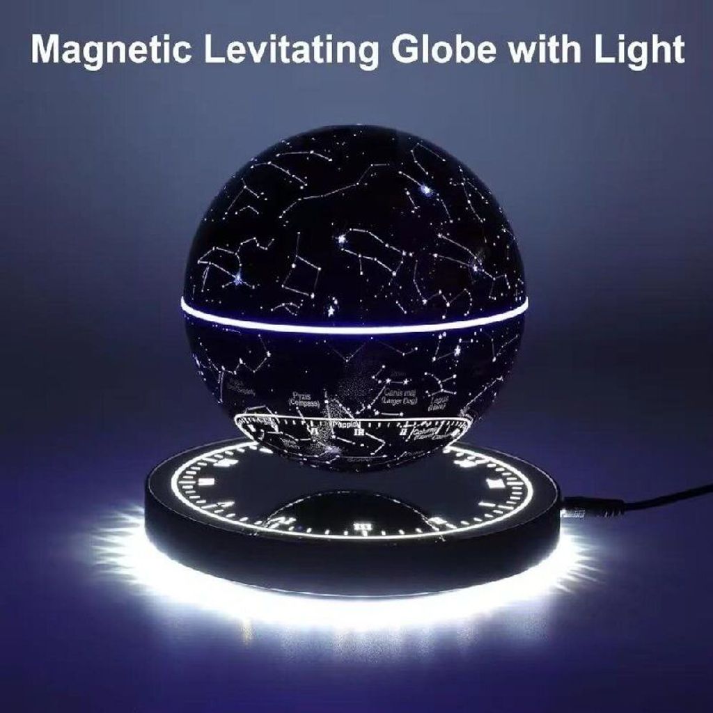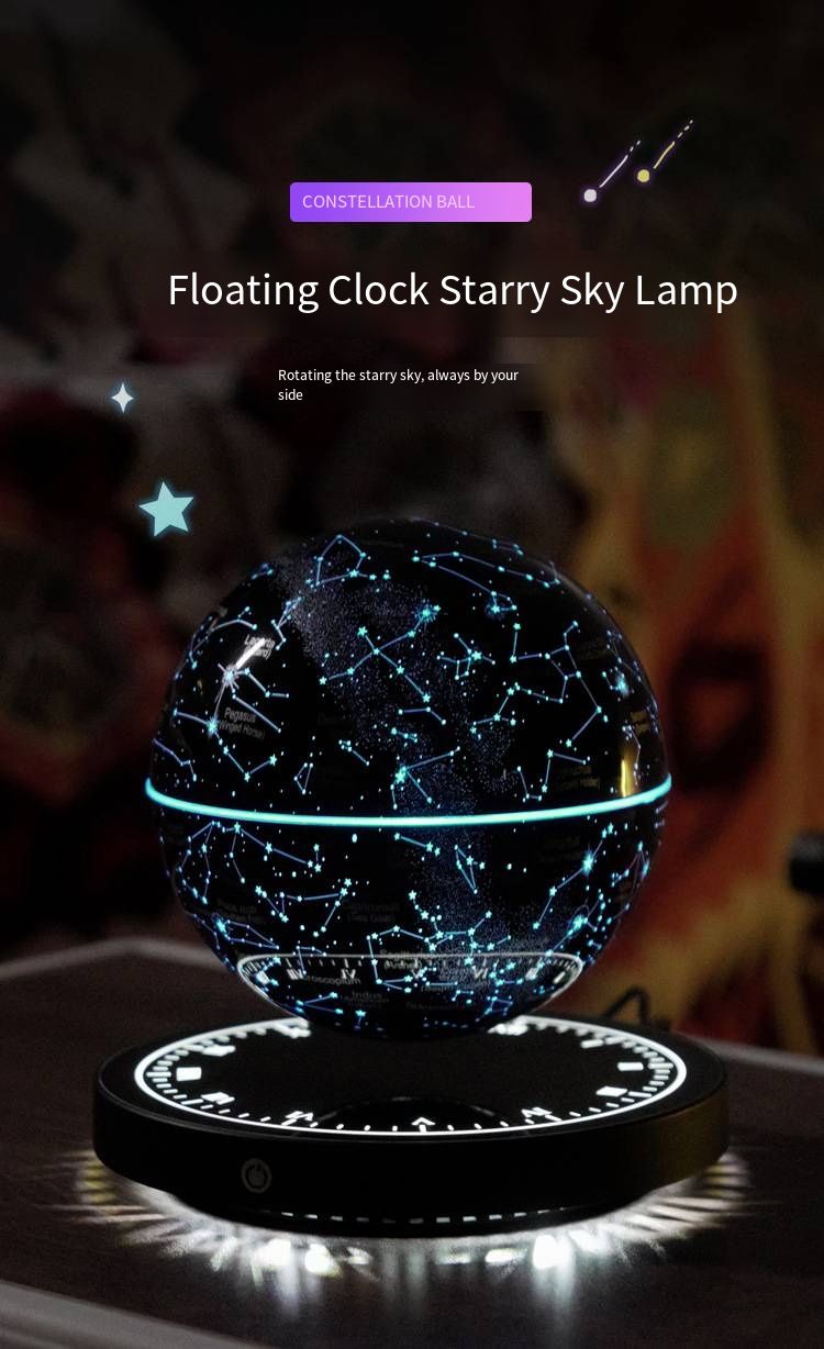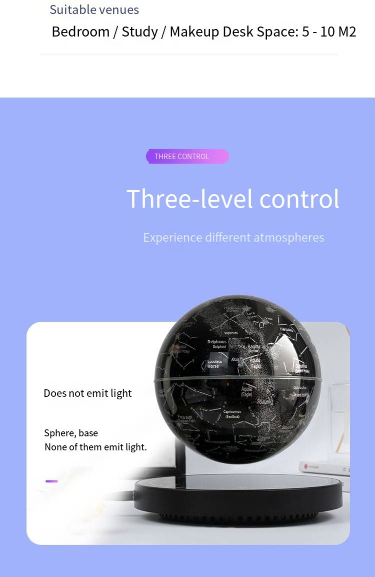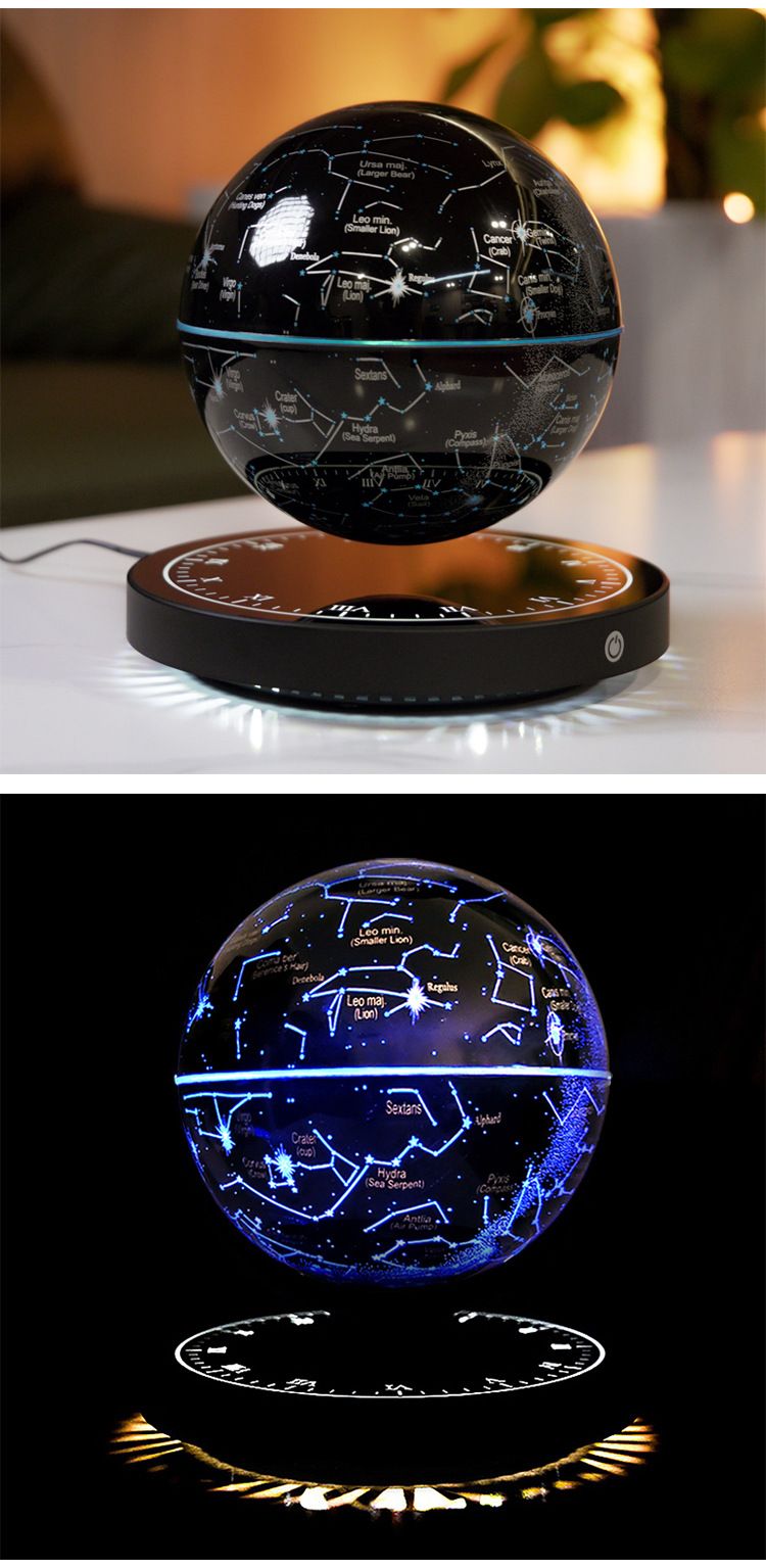 Magnetic levitation luminous globe. Suspended and rotating magnetically. The spherical surface is engraved with constellation patterns. It has four colors of lights: red, green, blue, and purple. When lit, it resembles a miniature galaxy. It can be used as a decorative item as well as a small night light. The base has markings. It rotates 360° to clearly view the constellations. Hold the starry sky in your palm. Your daily space instantly transforms into an observatory!