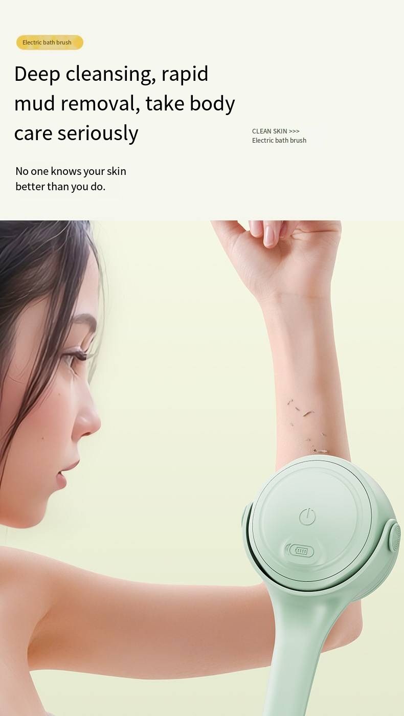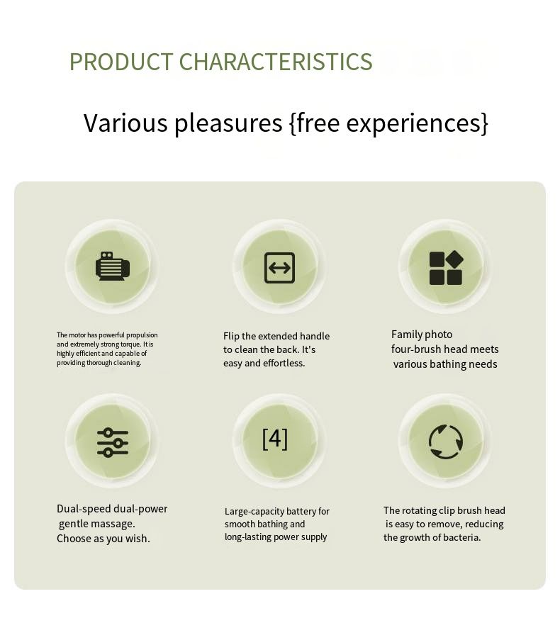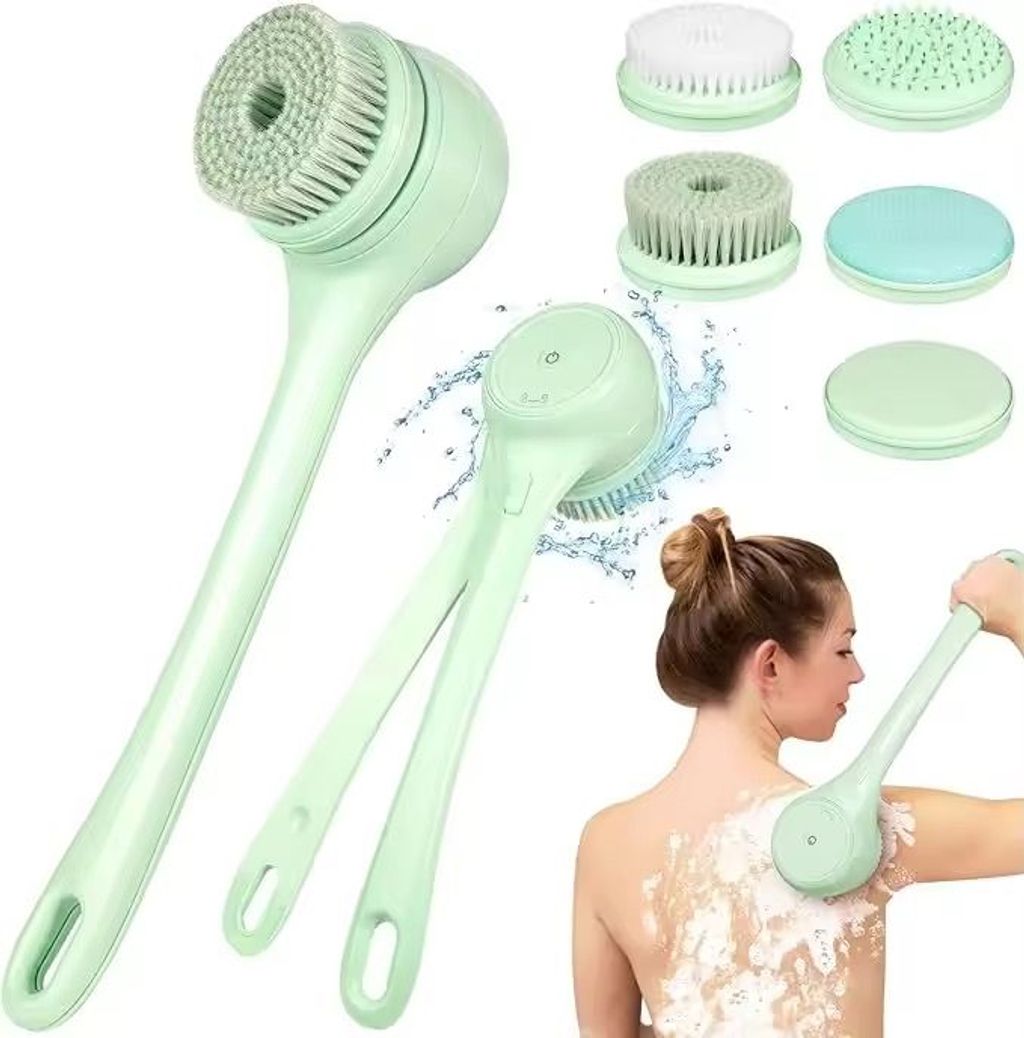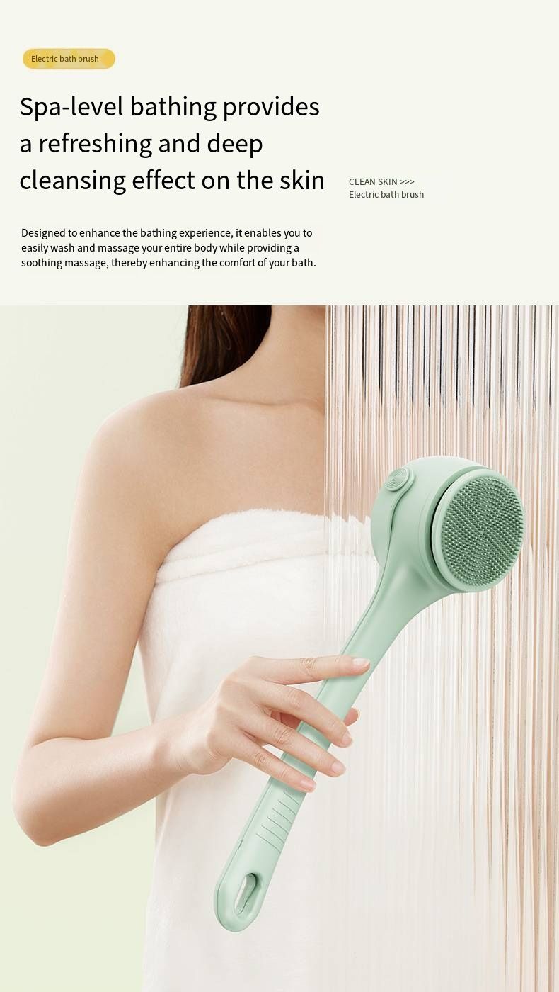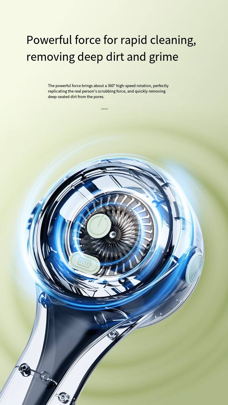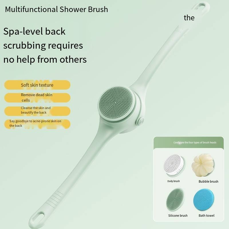 Multi-brush all-scenario compatible electric shower brush: 180° rotating long handle covering the back, joints, dead area. Electric deep cleaning system. 5 functions of brush heads (daily cleaning, gentle facial cleansing, soothing massage, exfoliation management, deep skin cleansing). Oil removal and dust removal. Relieves body fatigue. An efficient home tool that covers all aspects of bathing, cleaning and care for the entire body in one package.