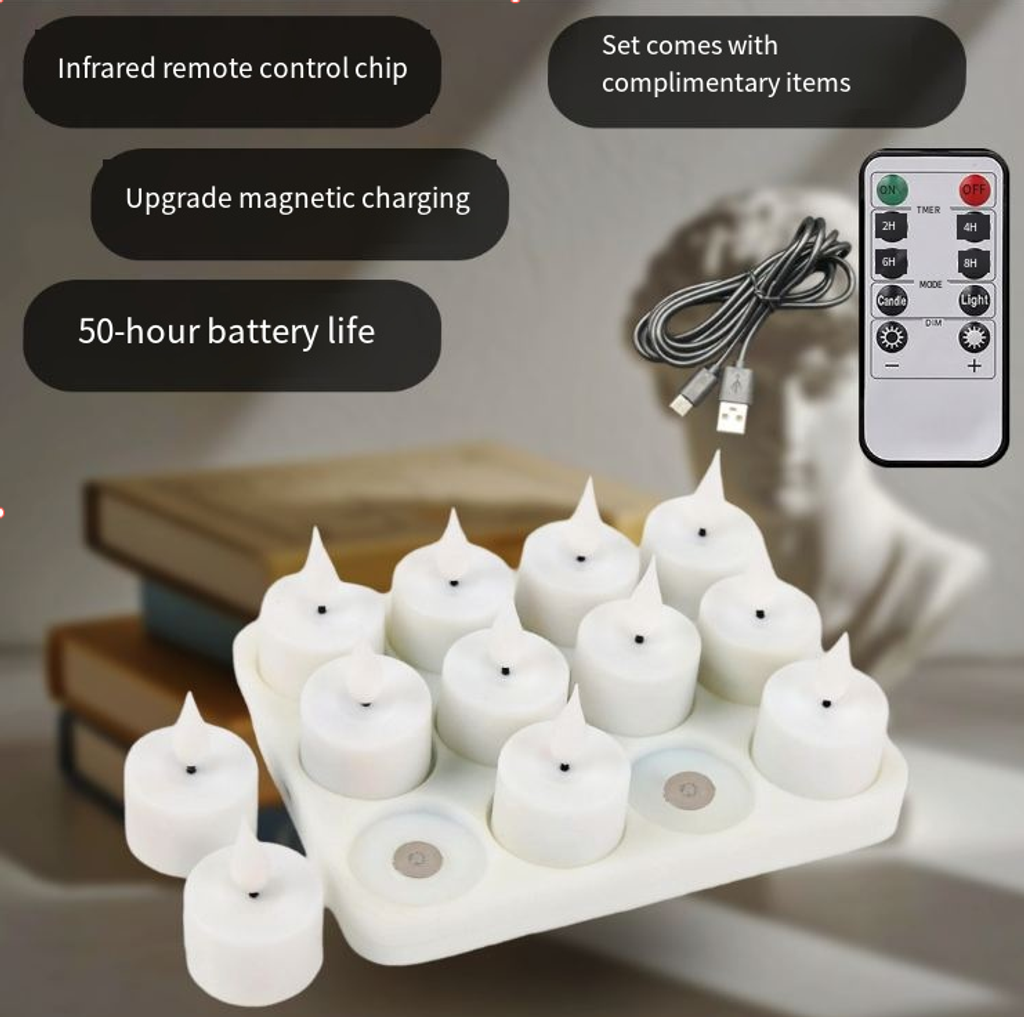 Non-flaming electronic candle lamp, magnetically attached for charging, with a battery life of 50 hours (5 times that of the regular model), and infrared remote control for adjusting brightness. The flame-like warm light is soft and realistic, suitable for various scenarios, and safe with no risks. The package includes a charging base and wires. It can be charged simultaneously with multiple wicks, making it easy to store and allowing for a simple creation of a cozy atmosphere.