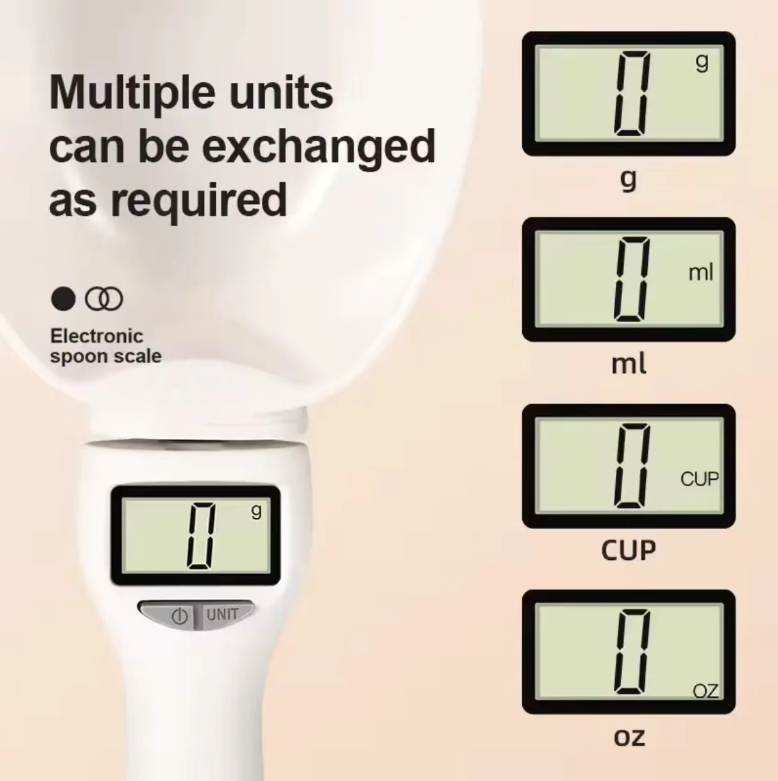 The ability to switch between multiple units is especially useful for baking enthusiasts: You can switch between g, ml, cup, and oz with one click. When following an online recipe to make desserts, you don't have to struggle with unit conversions. Just after scooping, you can directly use it and skip the effort of looking up conversion tables.
