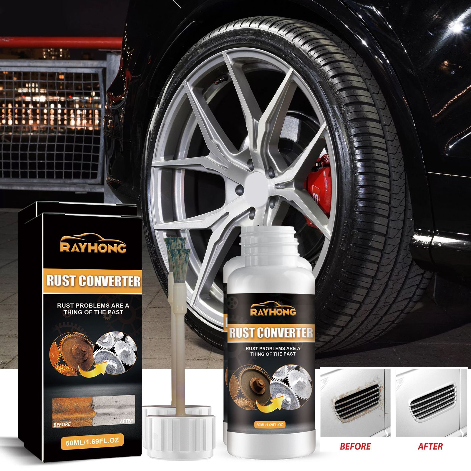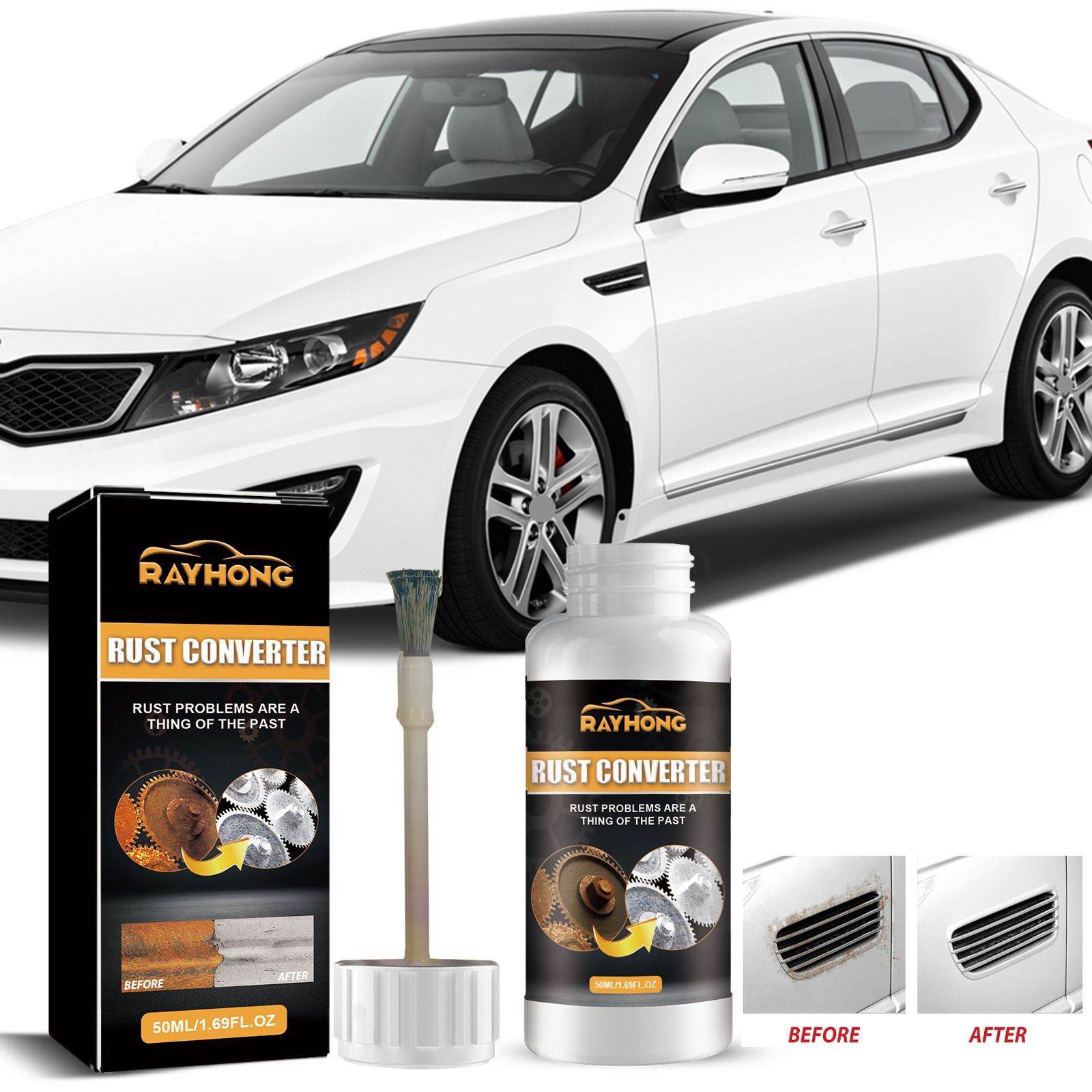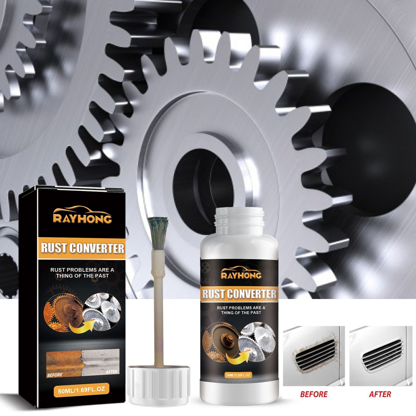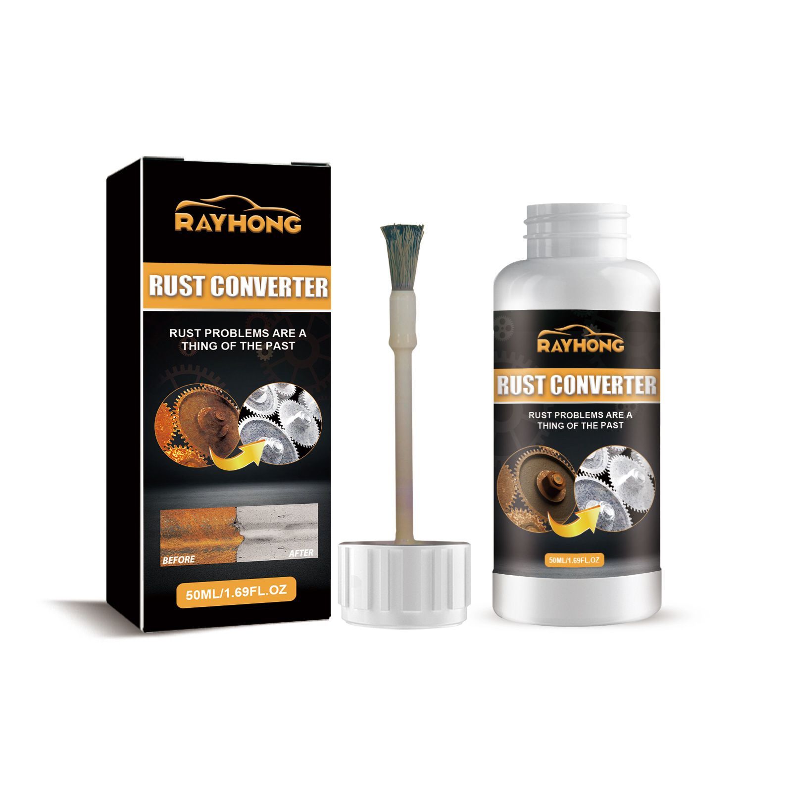 When the wheels of your beloved car gradually develop blemished rust spots, and when the mechanical gears are covered with dull rust layers that lose their luster, rust not only lowers the appearance level but also quietly wears down the lifespan of the metal - RAYHONG 50ML Rust Converter is precisely designed to solve such problems.