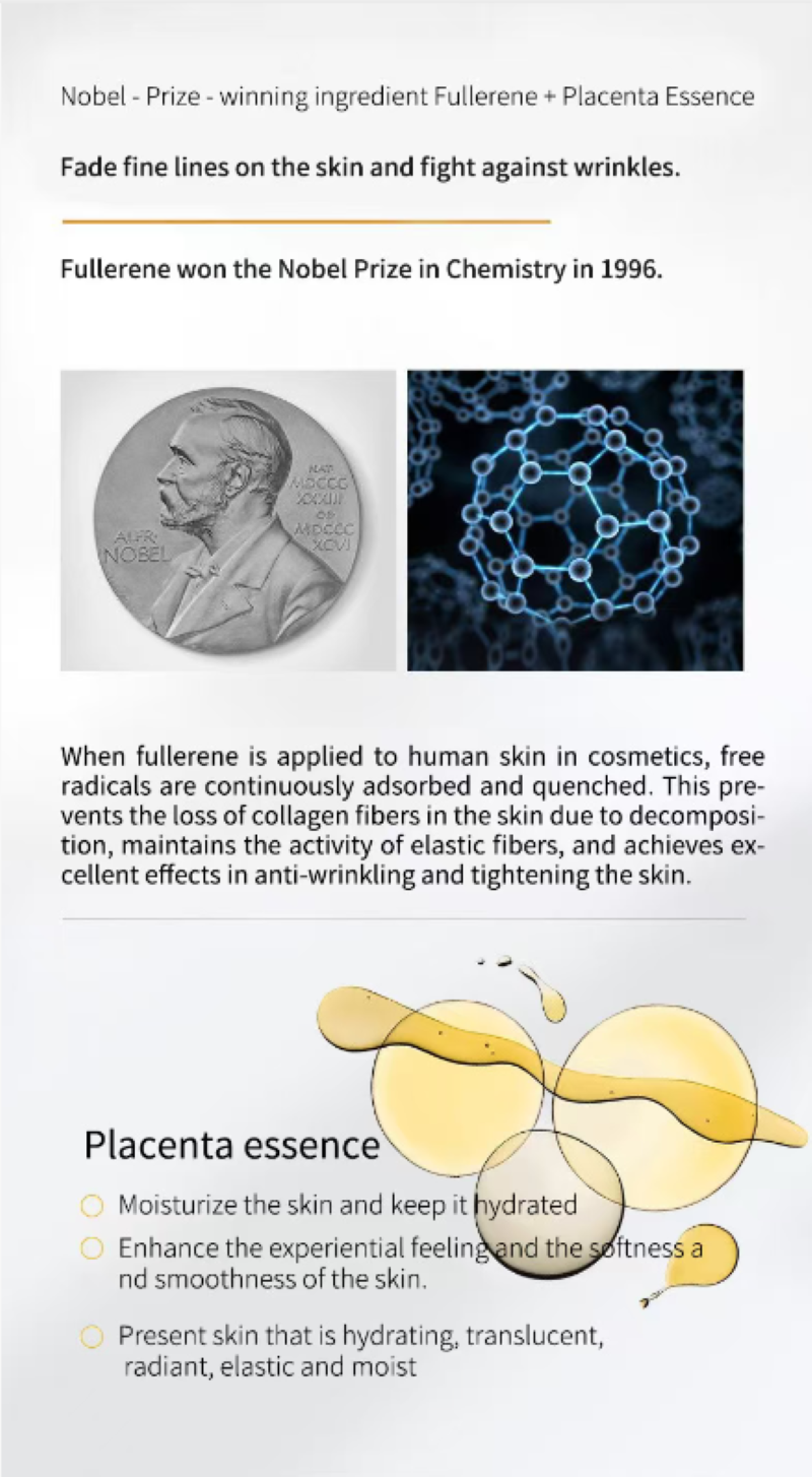 When you unscrew it, it's a soft and moisturizing essence texture. When you apply it, it's like melted butter coating your face, not sticky on the pillow or leaving a greasy residue. After a long night of staying up, your sagging face becomes hydrated, and the yellowish dullness gradually fades into a transparent luster. The "anti-aging duo" of fullerene and placenta extract, push the dry and fine lines back into the skin, and even the jawline feels gently lifted. When you wake up in the morning, touching your face is soft and firm, not the fake stiffness.