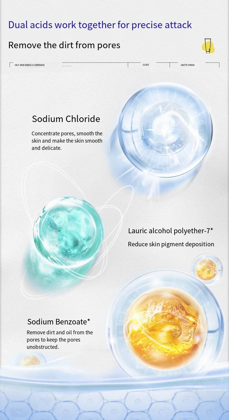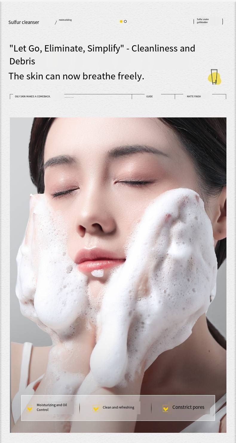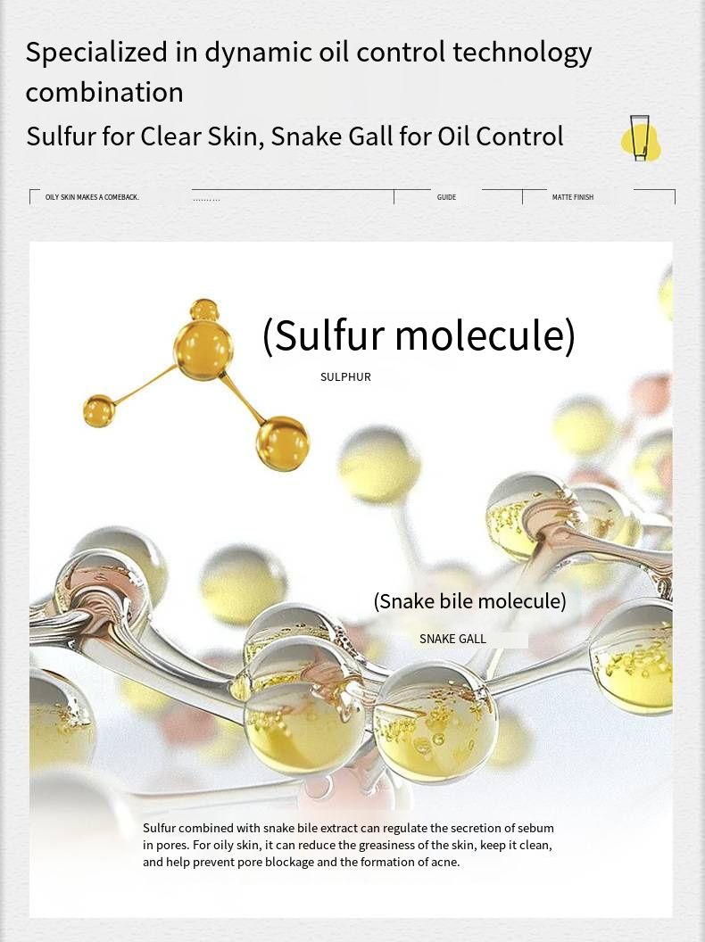 It is based on a sulfur + snake gall skincare system: The sulfur molecules precisely cleanse the skin, gently regulating the skin condition; the snake gall anti-oil components work together, combined with the "dynamic oil control formula", they weaken the signal of oil secretion from the pores at the source, and after one cleansing, you can feel the "oil shine fading" with a refreshing sensation.