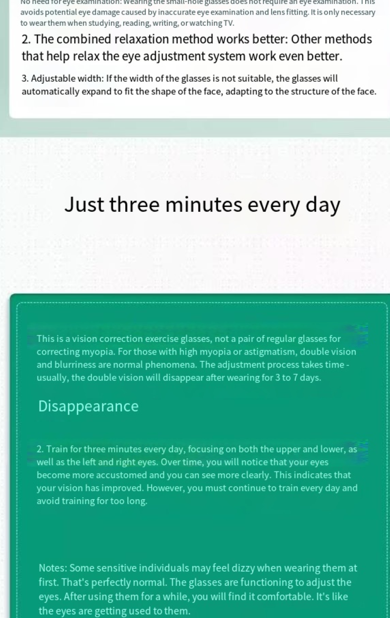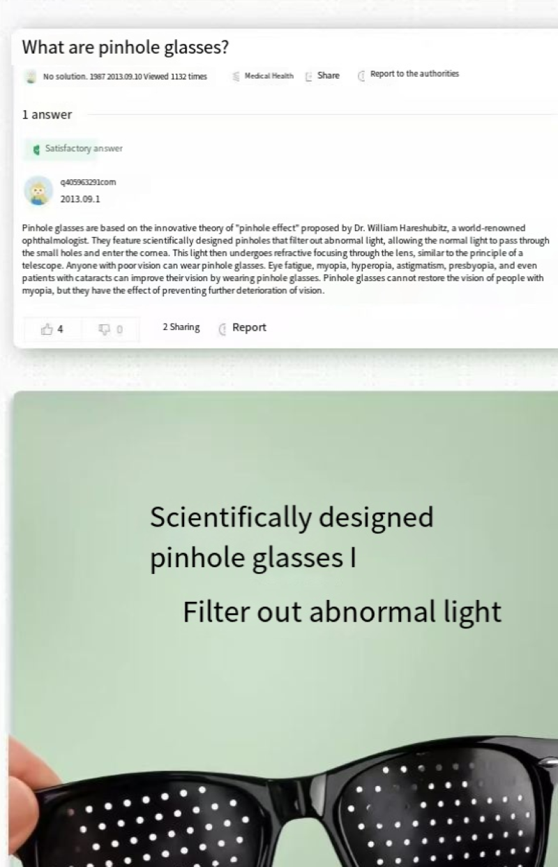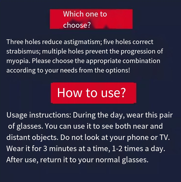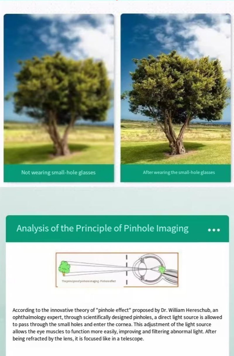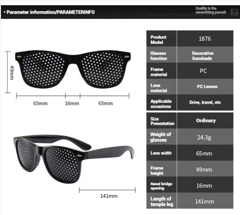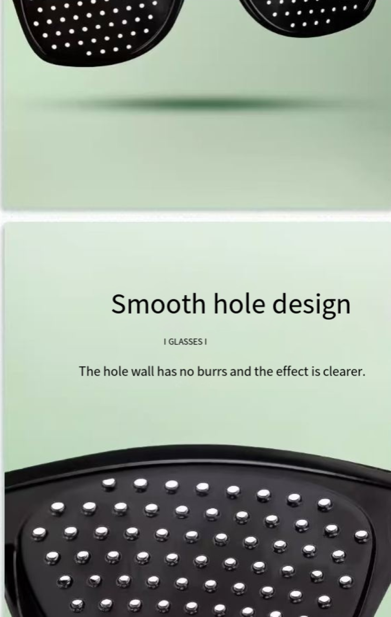 The vision correction glasses we have launched are a perfect blend of technology and health. It employs advanced pinhole imaging technology. By distributing tiny holes on the lenses, it effectively regulates the way light enters the eyes, reducing the burden on the eye's adjustment mechanism, thereby helping to improve vision conditions. Whether it's the blurriness caused by myopia, the double images from astigmatism, or the visual discomfort caused by strabismus, these glasses can provide targeted correction solutions, allowing your vision to regain clarity and comfort.