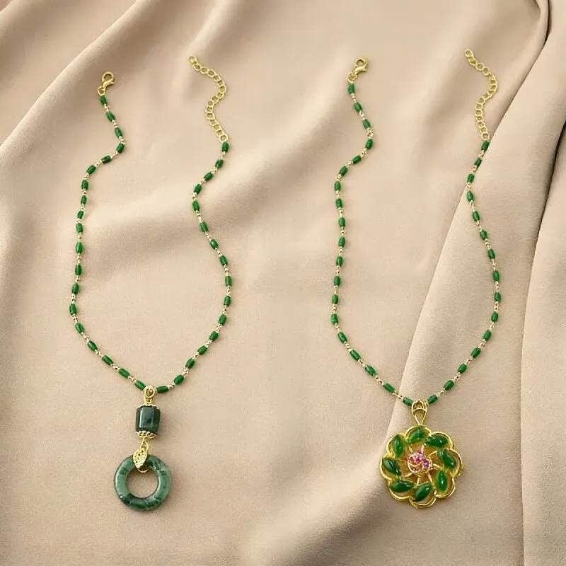 Order today and you will receive the Peace Charm + 2 pieces of Lucky Flower Jade Green Crystal Necklace, Transparent Green Crystal Fine Bead Chain, Chinese-style Atmosphere Lockbone Chain, which makes your skin glow and doesn't tighten your neck. Suitable for both work and casual occasions as a gift. It symbolizes peace and completeness. Engraved Petal Dazzling Design. A delicate accessory for daily wear.