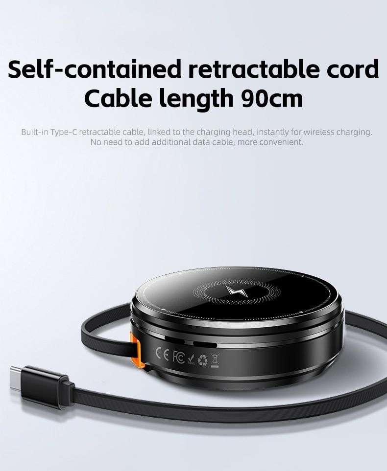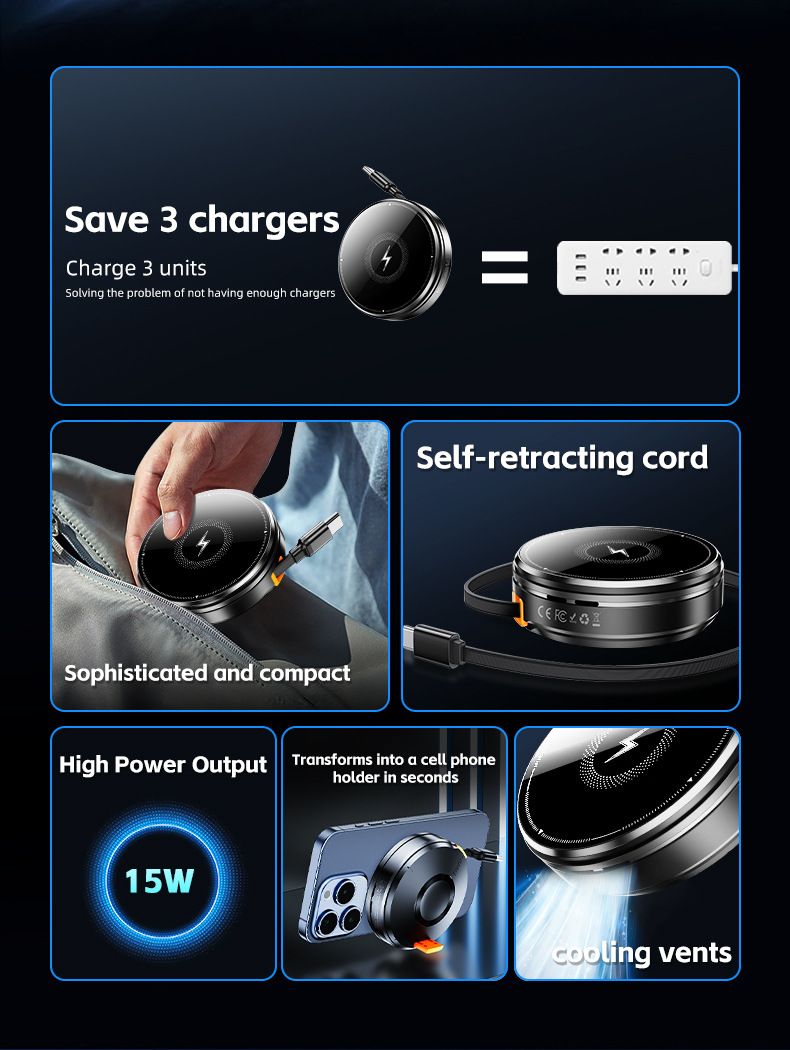 With a minimalist design the size of just your palm, it can be easily carried in your pocket and completely eliminates the bulkiness and inconvenience of charging devices. It supports 15W full-speed fast charging and is compatible with multiple devices such as mobile phones, watches, and AirPods, meeting all charging needs in various scenarios at once. With an over 1000g strong magnetic adhesion force, it is stable like a stand and unlikely to fall off, allowing you to freely operate your devices during charging. The exquisite integrated appearance combined with the portable charging cable makes it the ideal lightweight and efficient charging option for commuting, traveling, or outdoor outings - packing the full range of charging experiences in a minimalist volume.
