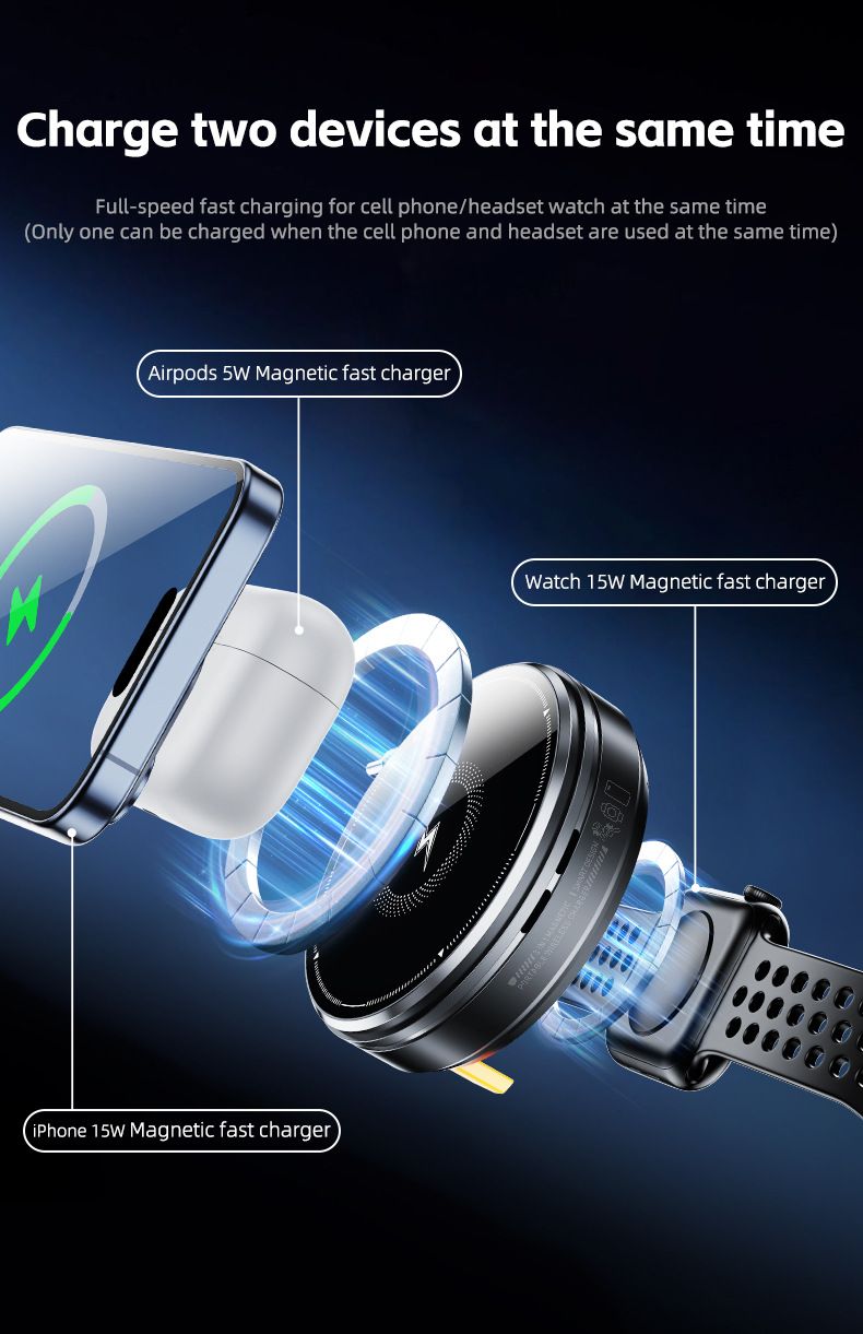 It is not just "small", but also "all-inclusive": Equipped with 15W full-speed charging protocol, it is compatible with smartphones, smartwatches, and AirPods - attach the phone and it starts 15W flash charging, match the dedicated 15W magnetic charging area for the watch, and AirPods can be charged through the 5W magnetic interface. With a single connection, it can cover the charging needs of all your daily digital devices (note: when using the phone and headphones simultaneously, only one device is supported for charging).