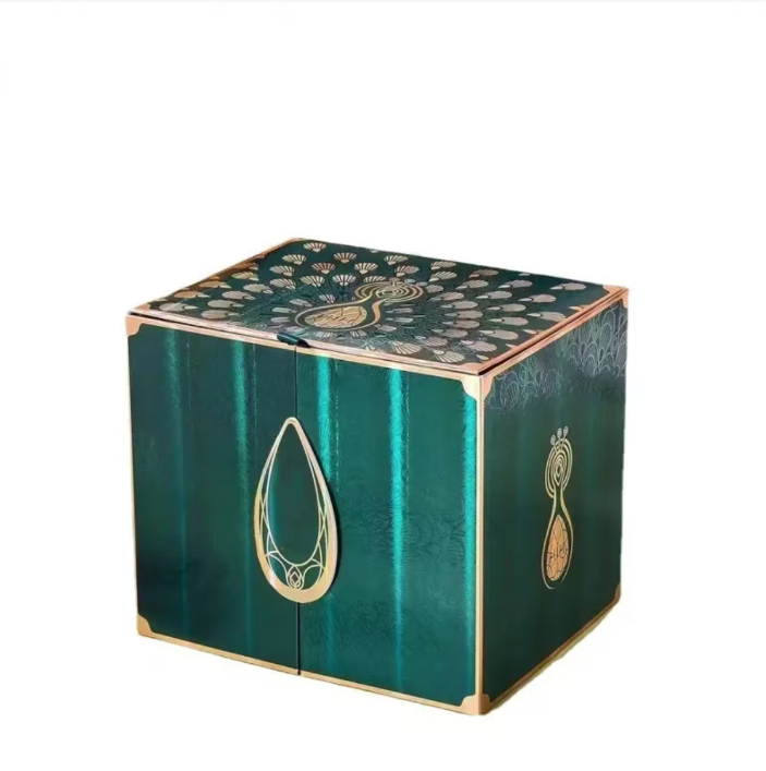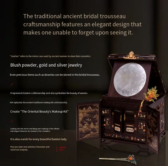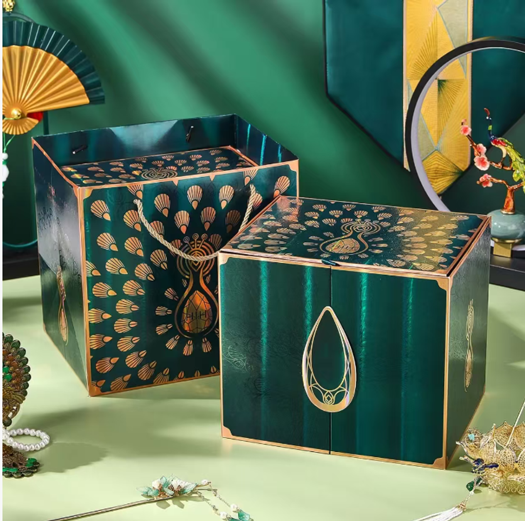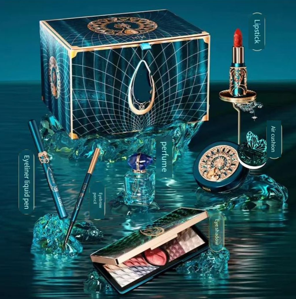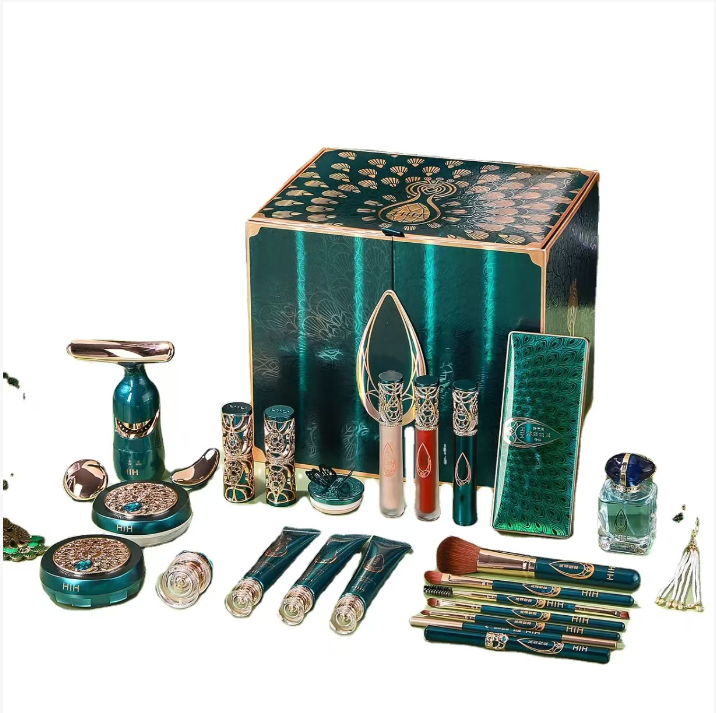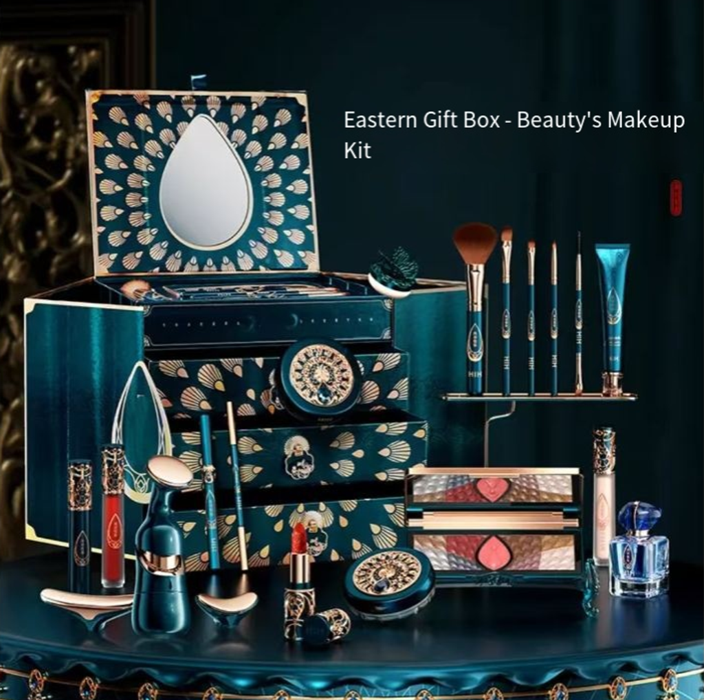 This is far from a makeup set; it is undoubtedly a "peacock feather" displayed on the dressing table - the dark green and gold lacquered box is adorned with peacock feather patterns, and the gold trim highlights the box surface to resemble a star-drenched surface. When opened, a three-tier array of makeup products is presented, even the mirror has a water-drop-shaped oriental charm, adding a sense of "prestige" to the tabletop.