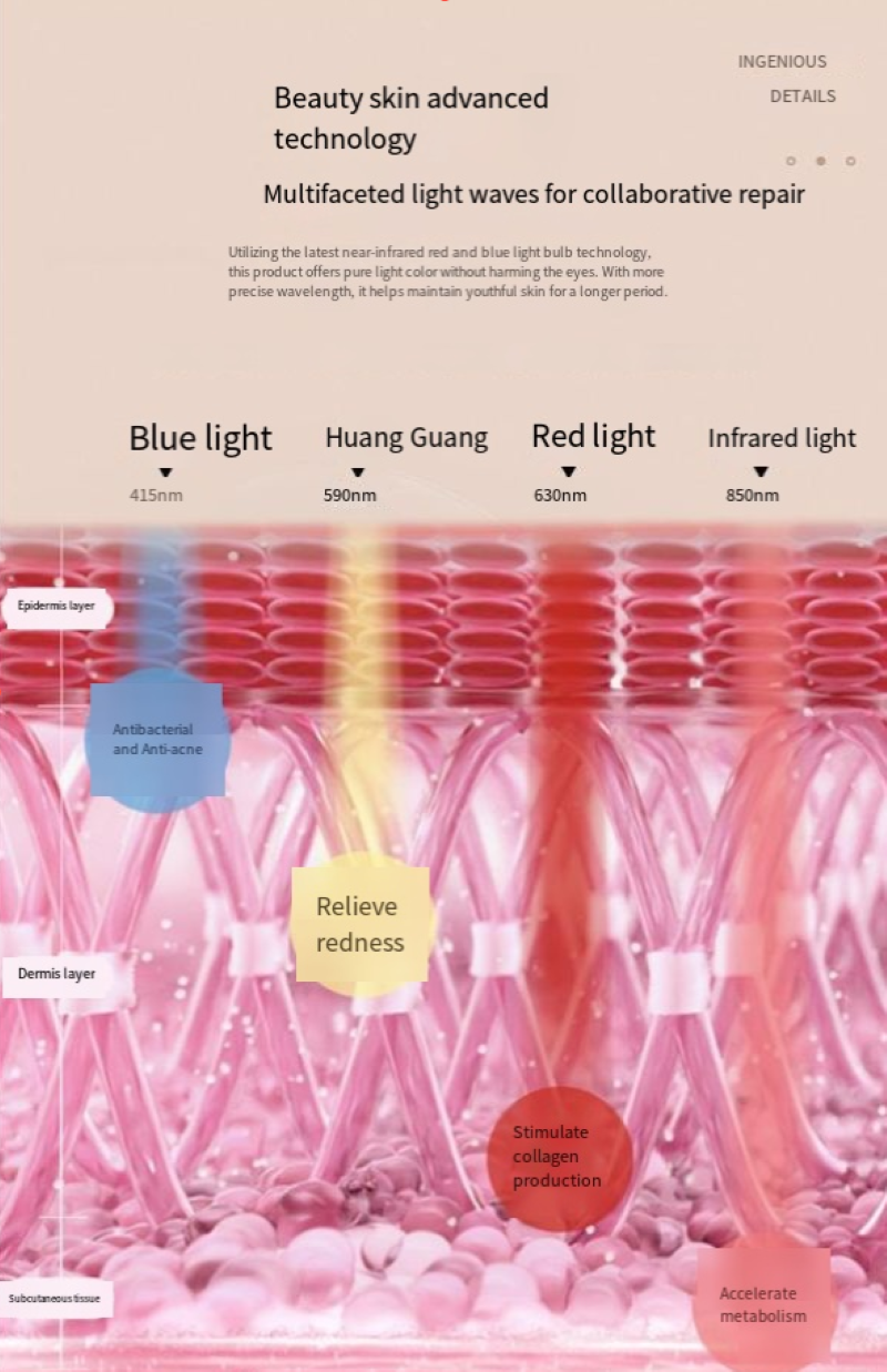 It features multi-wavelength photon skin rejuvenation technology, with the synergy of red, blue, and yellow light spectra: Red light penetrates deep into the skin, stimulating collagen production and reducing fine lines and tightening the skin; Blue light targets acne propionibacterium, improving oily and acne-prone skin; Yellow light evenens the skin tone and brightens dullness. After being tested by 30 users, it was found that the skin's moisture content increased by 34.34%, oil secretion improved by 31.15%, and smoothness increased by 16.02%. The visible transparency from the inside out is evident.