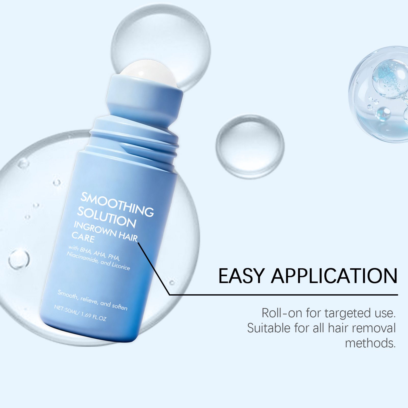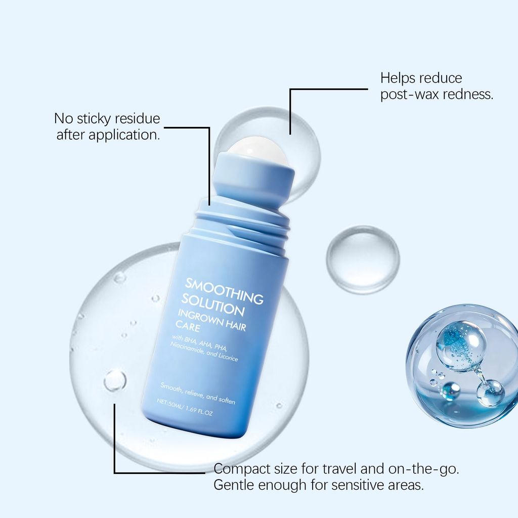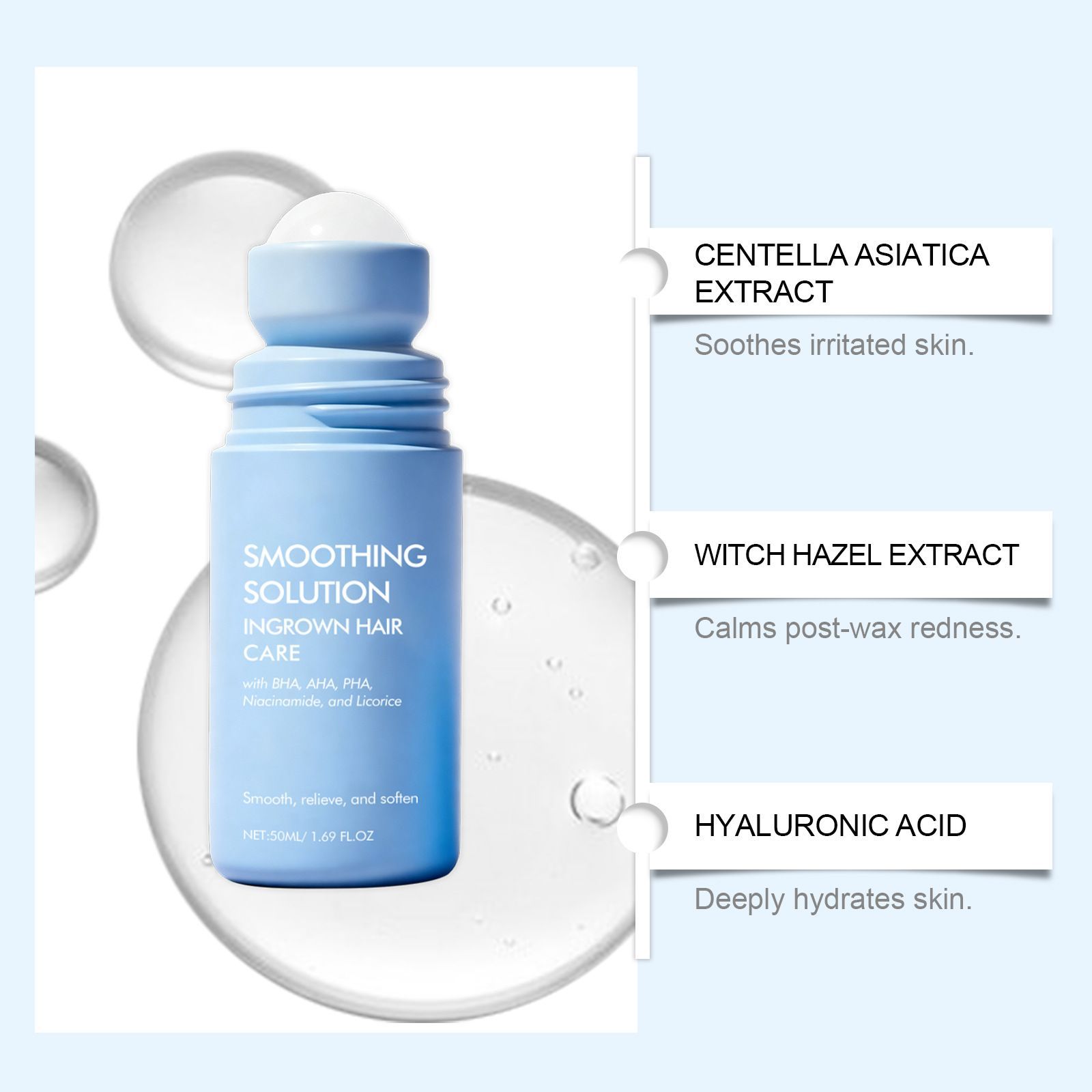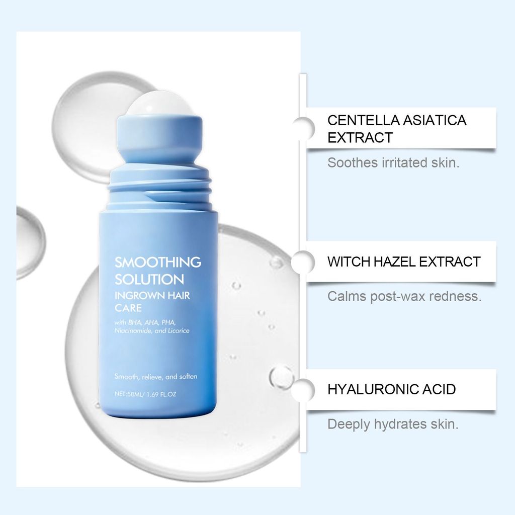 SMOOTHING SOLUTION Post-Hair-Removal Soothing Solution is Your Ultimate Post-Waxing And Shaving Savior. Infused With A Powerful Blend Of BHA/AHA/PHA Complex Acids, Centella Asiatica, And Witch Hazel, It Targets Ingrown Hairs, Improves Keratosis Pilaris, And Calms Irritation Instantly. Hyaluronic Acid And Niacinamide Deeply Hydrate, Lock In Moisture, And Strengthen The Skin Barrier To Prevent Dryness And Redness. The Mess-Free Roll-On Applicator Ensures Precise, Hygienic Application Anytime, Anywhere. Compact 50Ml Size Is Perfect For Travel, Home, Or On-The-Go Touch-Ups. Gentle, Non-Sticky, And Sensitive-Skin Friendly, It Delivers Long-Lasting Smoothness For Underarms, Legs, And All Intimate Areas.