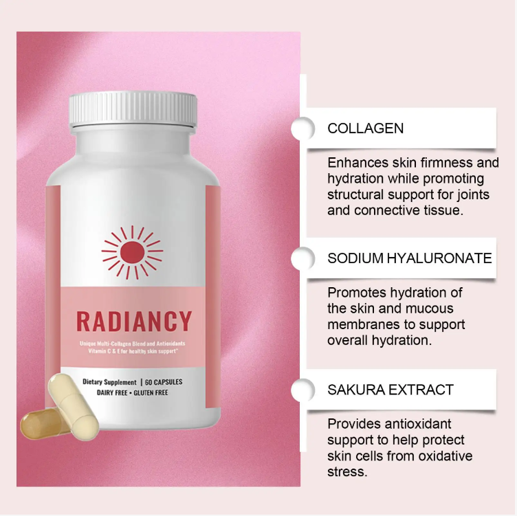 Don't let busyness and time steal your health and beauty any longer. Choose RADIANCY probiotic capsules, take two capsules daily, allowing collagen to reshape the skin and joints, sodium hyaluronate to deeply hydrate and moisturize, cherry extract to resist oxidation, and the 60 capsules' thoughtful packaging will accompany you through every transformation day and night. From today on, let the inner health vitality manifest as the bright and clear skin, the flexible and light body, and live out your own life.