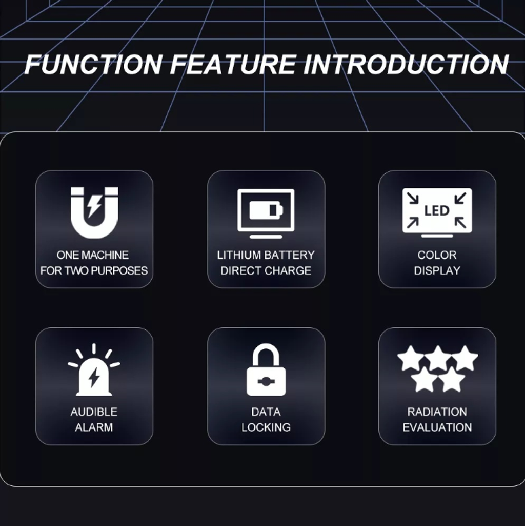 Electromagnetic radiation (mobile phones, computers, routers, microwave ovens, etc.): Detection range 0.01 - 1999 μT, resolution 0.01 μT, capable of accurately capturing radiation fluctuations during the operation of electronic devices, such as the radiation peak during phone calls and the radiation distribution around the router;