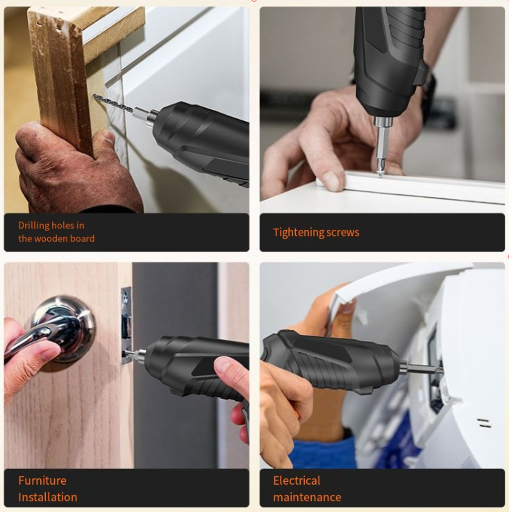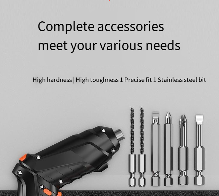 It is equipped with multiple-sized bits and sockets, covering cross,一字, hexagonal, etc. types, which can not only tighten various screws but also drill holes on lightweight wooden boards, achieving "screw-drilling integration". The strong magnetic adhesion design ensures a close fit between the bit and the screw, preventing parts from falling off during high-altitude operations; long-lasting battery + universal charging port allows for recharging anytime, and can be carried around for use during moving or business trips.