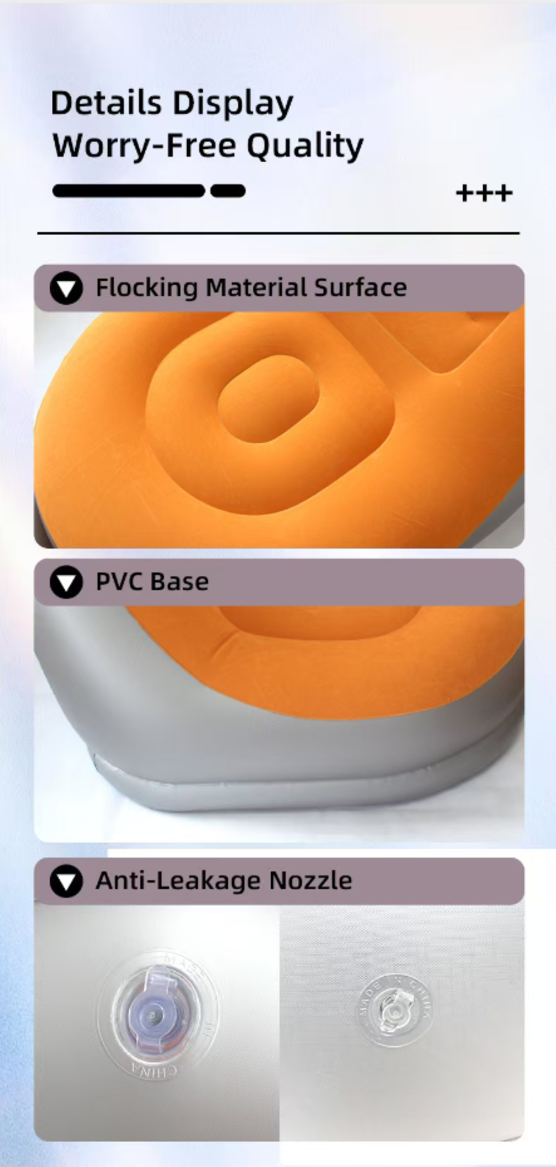 Shipping Air Pump The plush inflatable lazy sofa is soft and elastic, providing a non-collapsing feel. The plush fabric is skin-friendly and does not stick to sweat. The inflation and deflation process is convenient and hassle-free. When folded, it can be stuffed into a bag without taking up much space. It is suitable for various scenarios such as renting houses, camping, and balconies. Once set up, you can enjoy a completely relaxed and comfortable sitting experience.