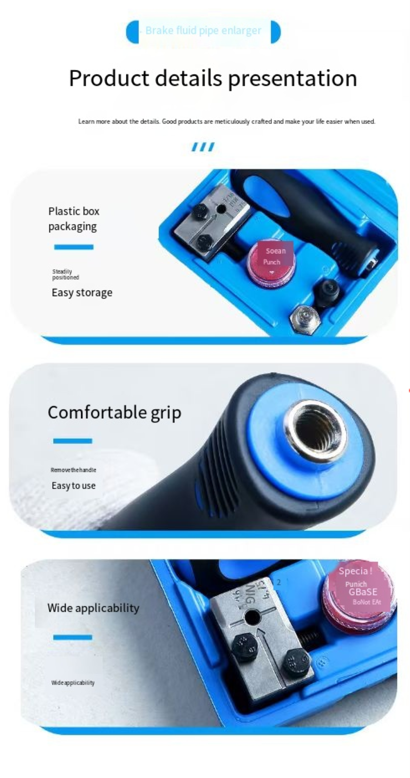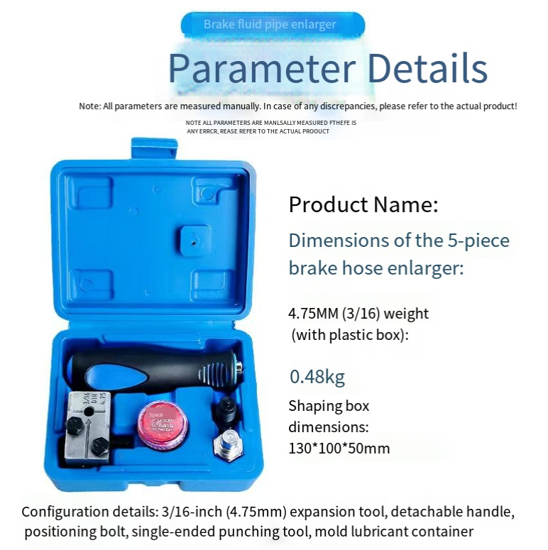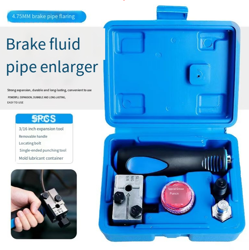Specialized 4.75MM brake tube, including handle, positioning bolt, punch and lubrication container. It can precisely expand the bubble opening and double expansion openings, ensuring a tight seal without any leakage. The strong and durable mold is easy to store in a portable box without losing any parts. It is suitable for auto repair, DIY oil change tubes, and can achieve professional expansion results with manual operation.