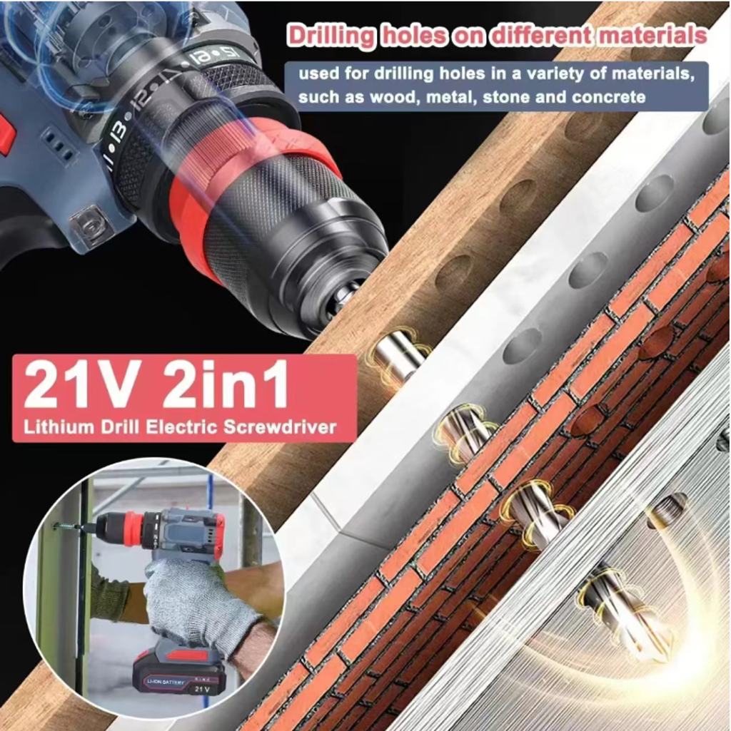 The 21V 2-in-1 lithium battery drill electric screwdriver can drill holes in various materials such as wood, metal, stone, and concrete. It is powered by lithium battery, portable and efficient. Whether for home repairs, construction work, or handicrafts, it can handle them easily. It provides strong power and a convenient experience for your drilling and screwing operations, and is your reliable tool assistant.